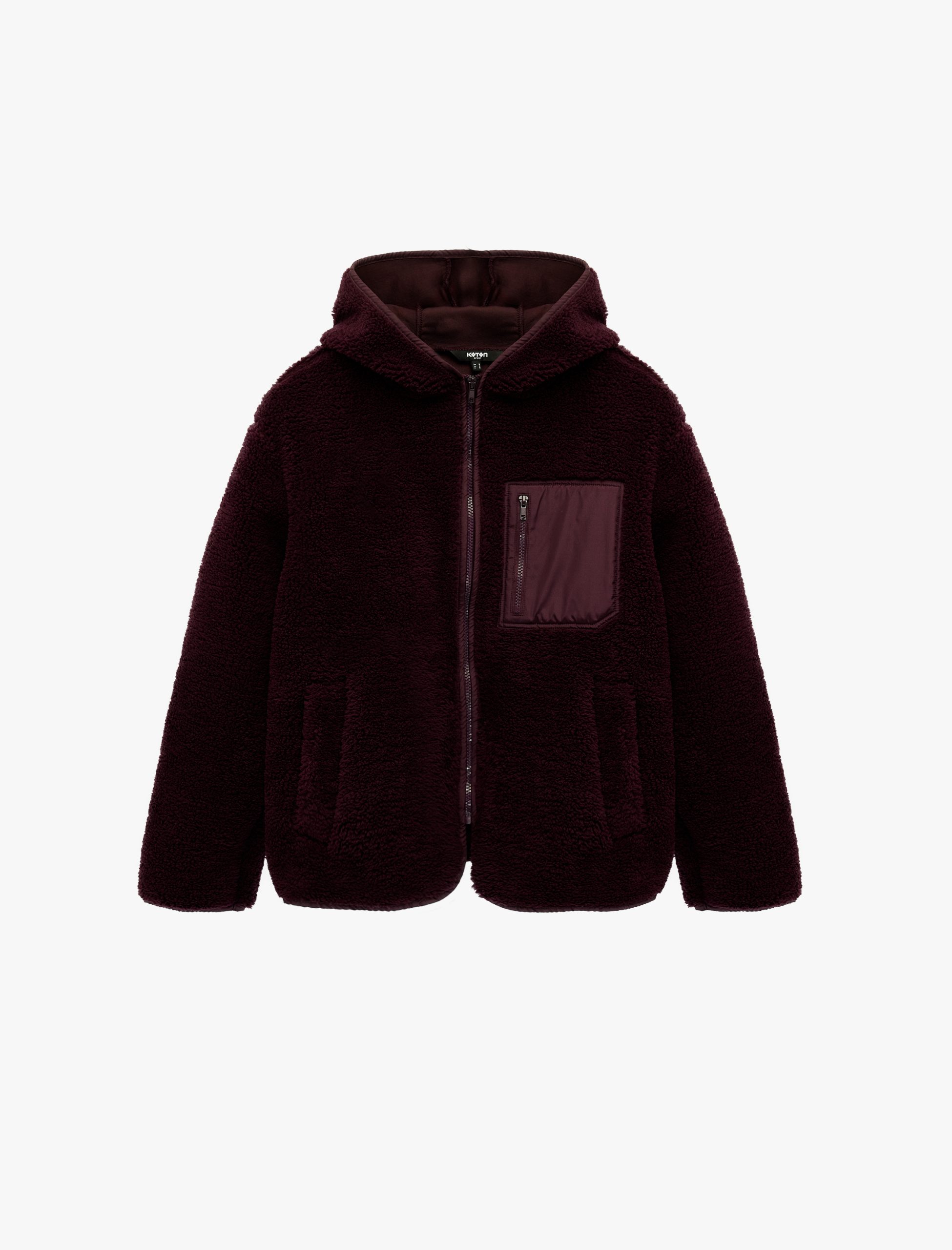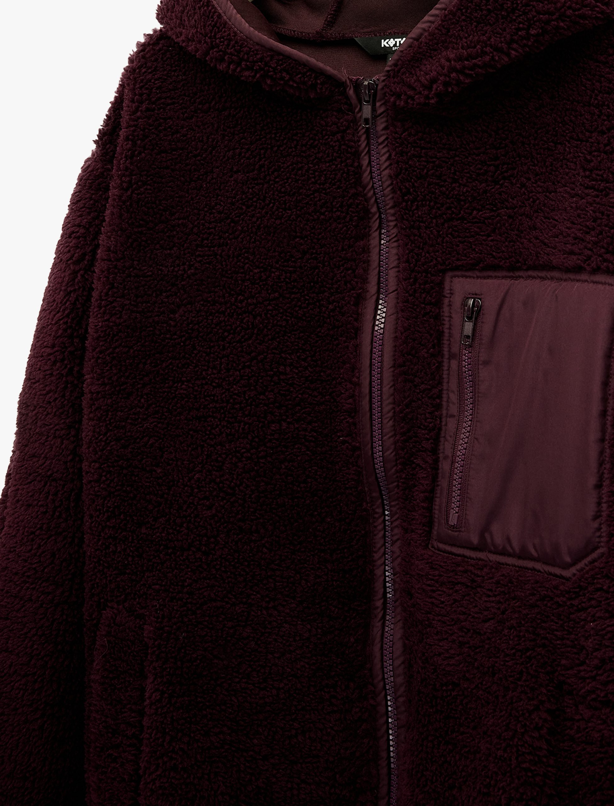 Kapüşonlu Uzun Kollu Fermuarlı Cep Detaylı Oversize Peluş Ceket