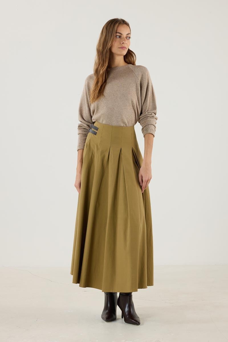Kemer Aksesuarlı Pileli Etek Zeytin Yeşili