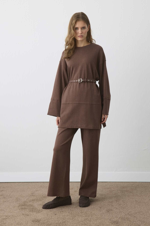 Kemer Detaylı Pantolonlu Kahve Takım