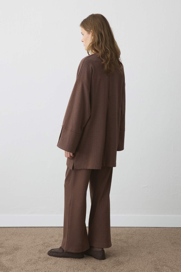 KEMER DETAYLI PANTOLON KAHVE TAKIM ÖZELLİKLERİ Seyyar kuş göz detaylı kemerli, geniş kollu, vatkasız, rahat kesim, yandan ufak yırtmaçlı, düşük omuzlu ve arkadan fermuar kapamalı, pantolon düz paça kesimli, cep detaylı, beli lastikli ve içte kalan ip detaylı, astarsız pantolonlu takım. Kumaş İçeriği ve Yıkama Talimat: %70 Pamuk %20 Viscon %10 Likra 30 derece de kısa programda makinede yıkayınız, hassas yıkama yapınız. Ürün Bedeni: S-M Manken Ölçüleri: