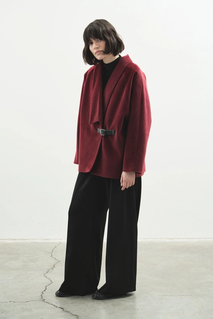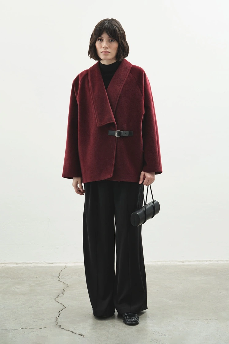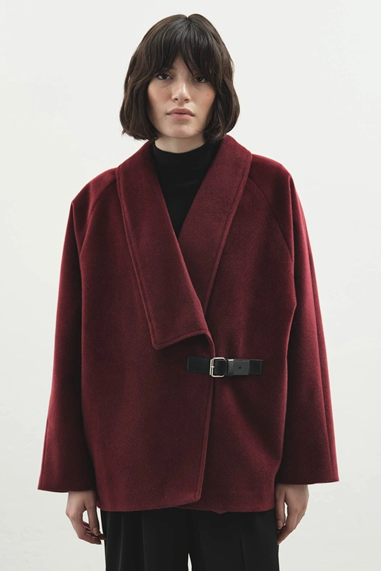 Kemer Tokalı Kaşe Bordo Kaban