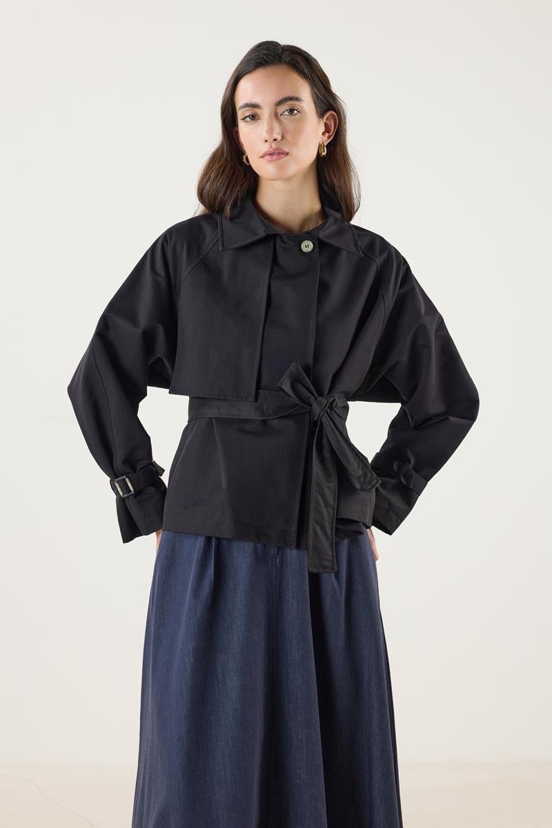 Kemerli Cepli Kısa Trençkot Siyah