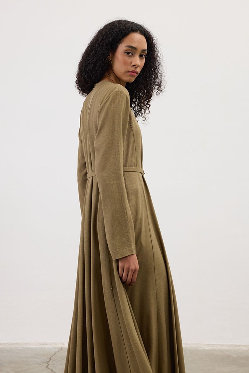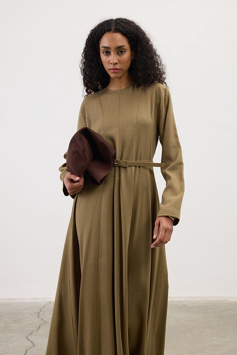 Kemerli Keten Elbise Haki
