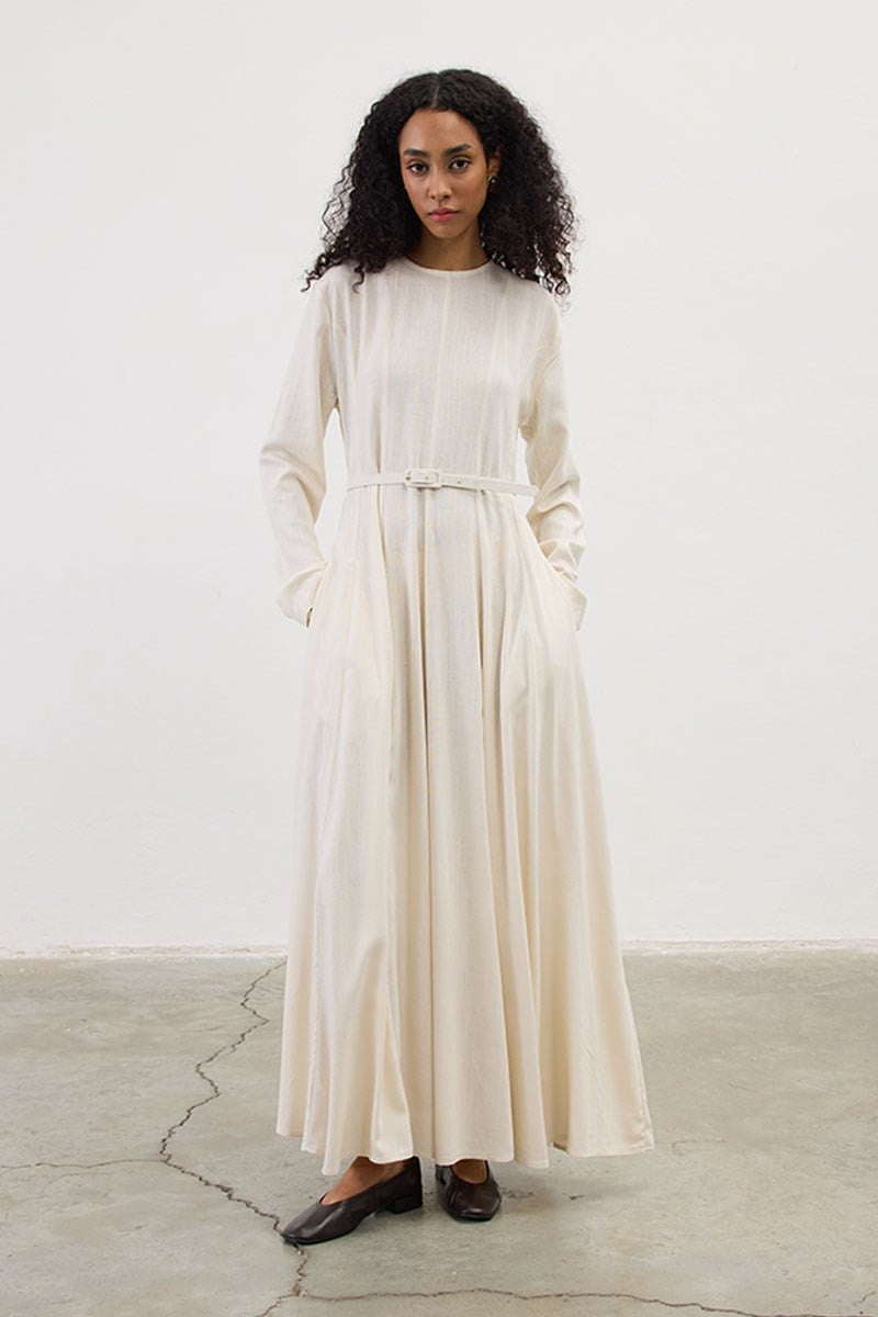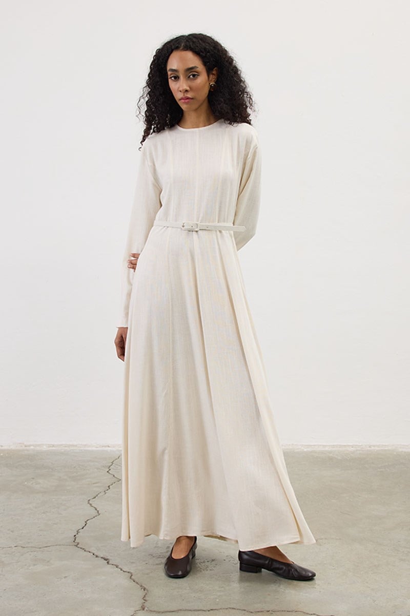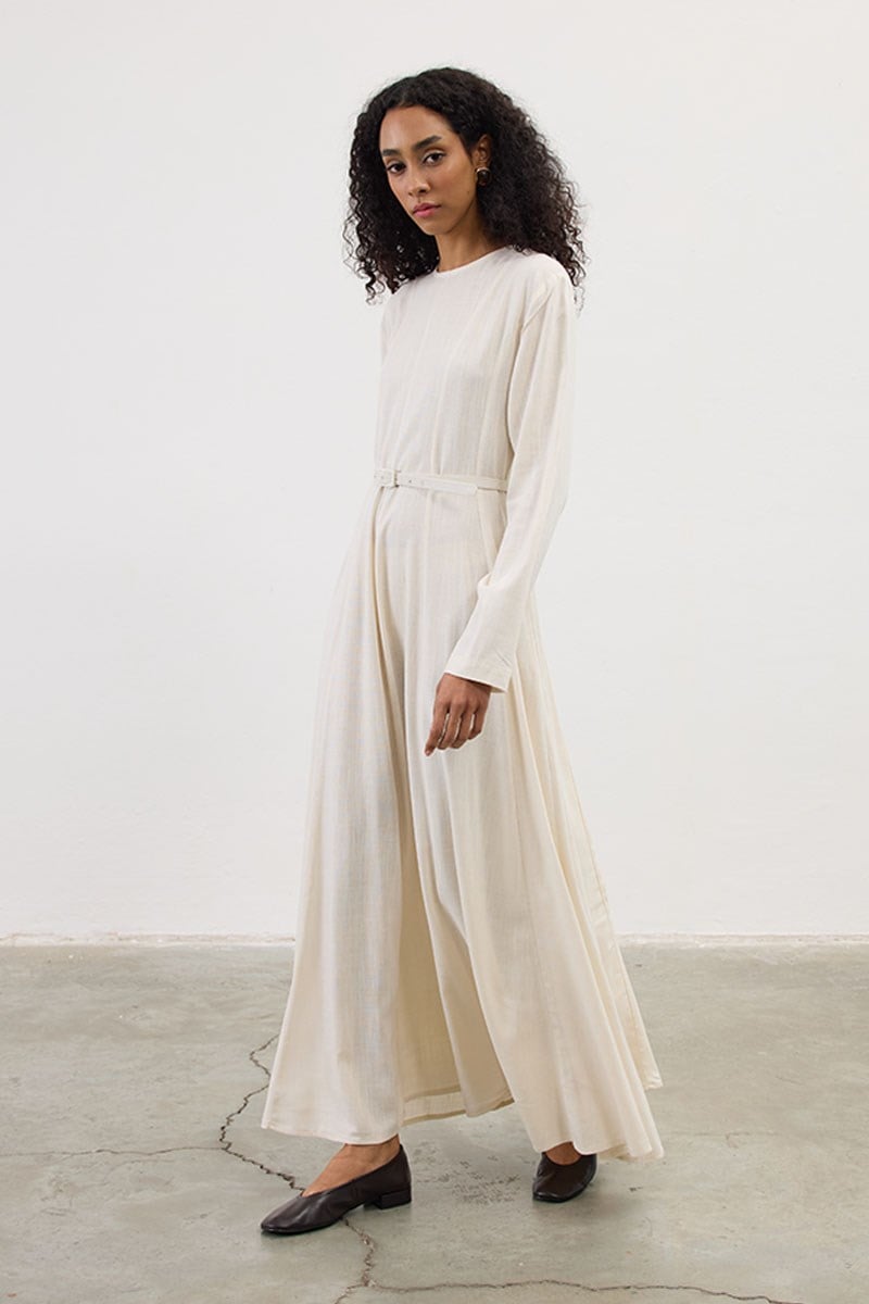 Kemerli Keten Elbise Krem