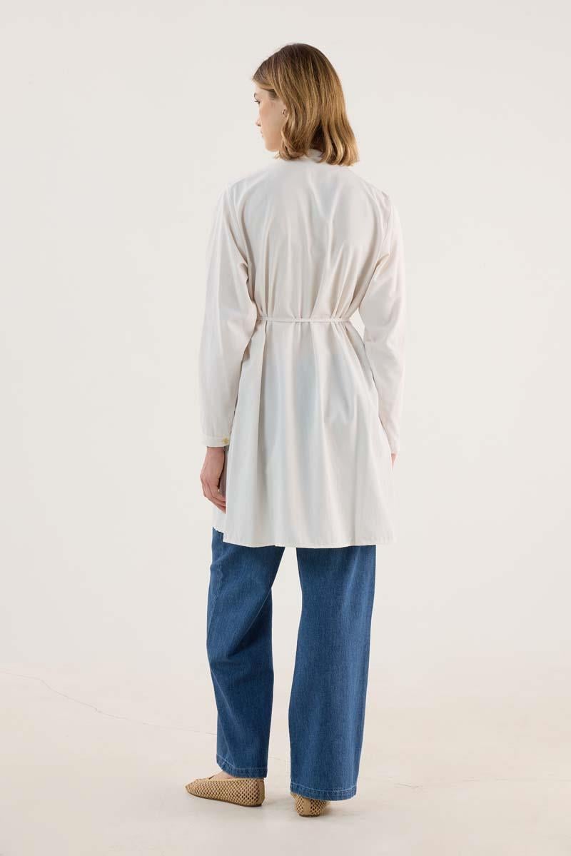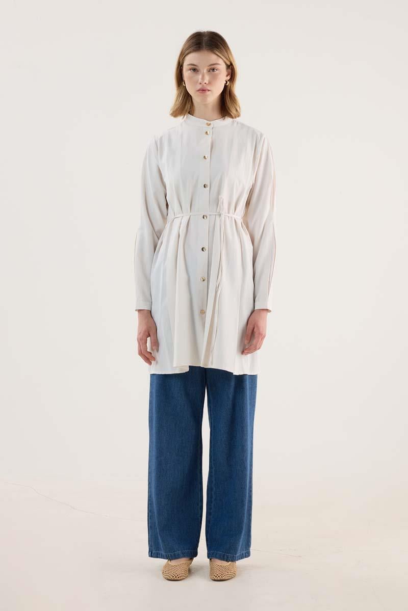 Doğal ve ferah bir görünüm sunan pudra rengi uzun tunik, yaz sezonunun hafif ve şık parçalarından biri. %88 Tencel ve %12 Pes karışımından üretilen kumaşı, yumuşak dokusu ve nefes alabilir yapısıyla gün boyu konfor sağlar. Minimal tasarımı, gizli patlı düğme detayı ve eteğinde yer alan zarif kavis kesimi ile modern bir duruş sergiler. Geniş manşetli uzun kolları ve rahat kesimi sayesinde hareket özgürlüğü sunan tunik, hem günlük kombinlerde hem de ofis şıklığında rahatlıkla tercih edilebilir. Nötr ve pastel tonlardaki pantolonlarla mükemmel uyum sağlar, aynı zamanda topuklu sandaletler veya düz ayakkabılarla farklı stillere uyarlanabilir. Zarif pudra tonu ile gardırobunuza taze ve huzurlu bir dokunuş katar.