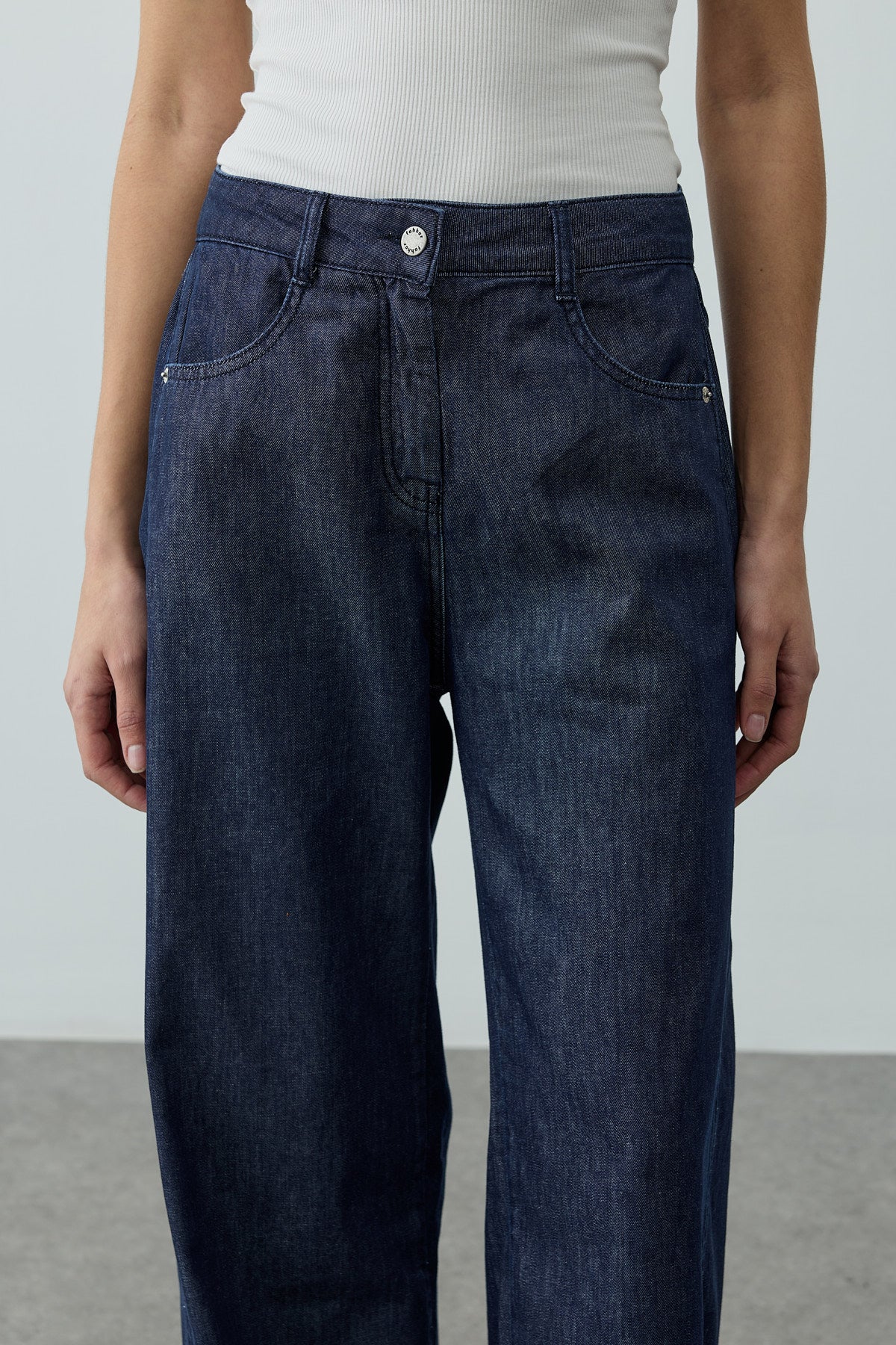 Denim dokuma kumaştan, kemer köprülü, yüksek bel, cepli, yandan yırtmaç açılım detaylı, önü fermuar ve düğme iliklemeli pantolon.