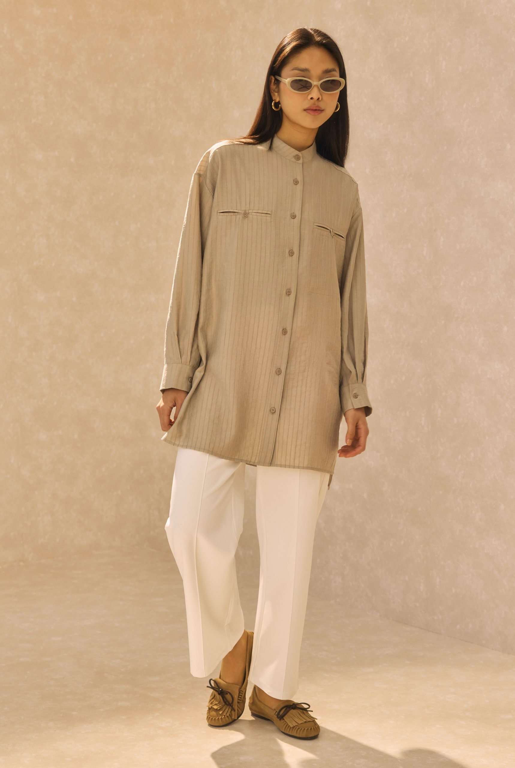 Birit kapama düğmeli, rahat kalıp, yumuşak dokulu özel tasarım süet gömlek.