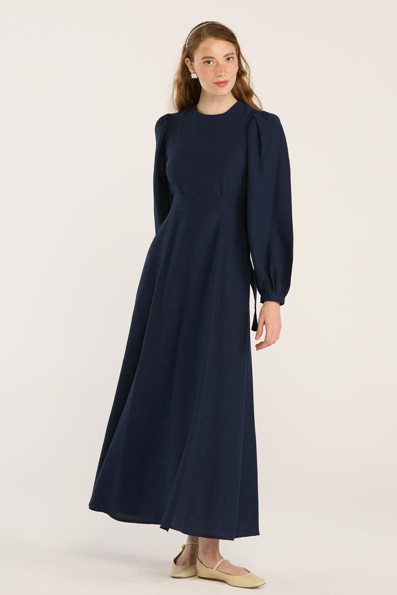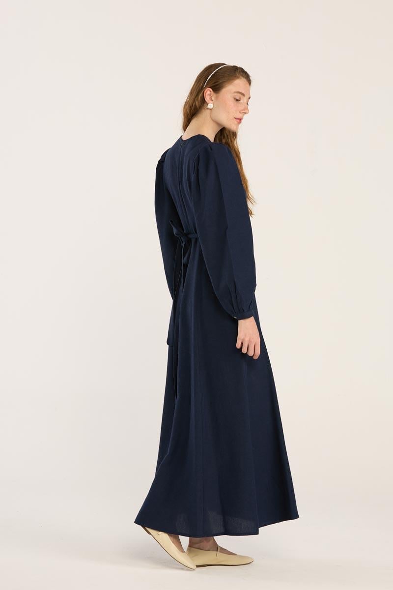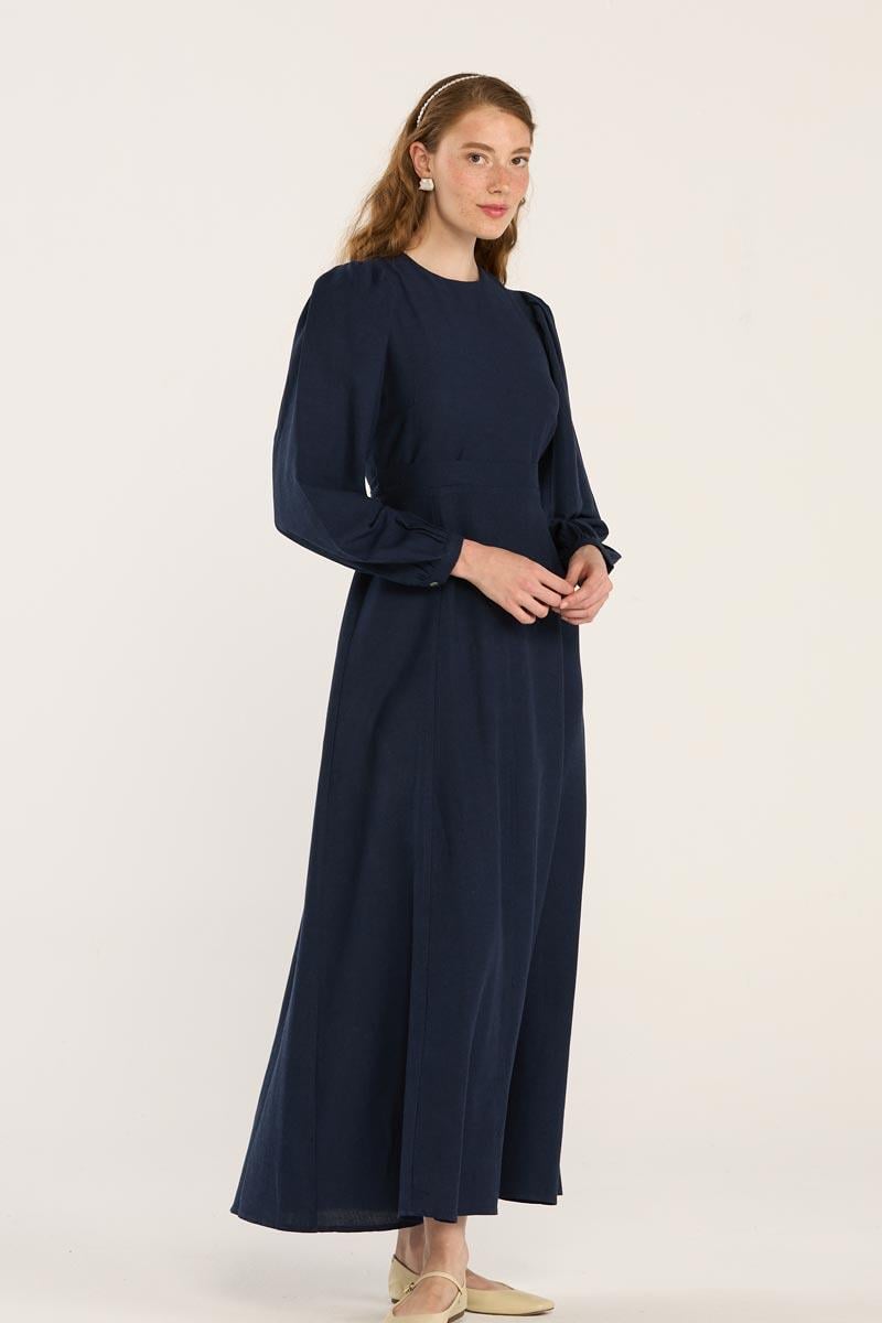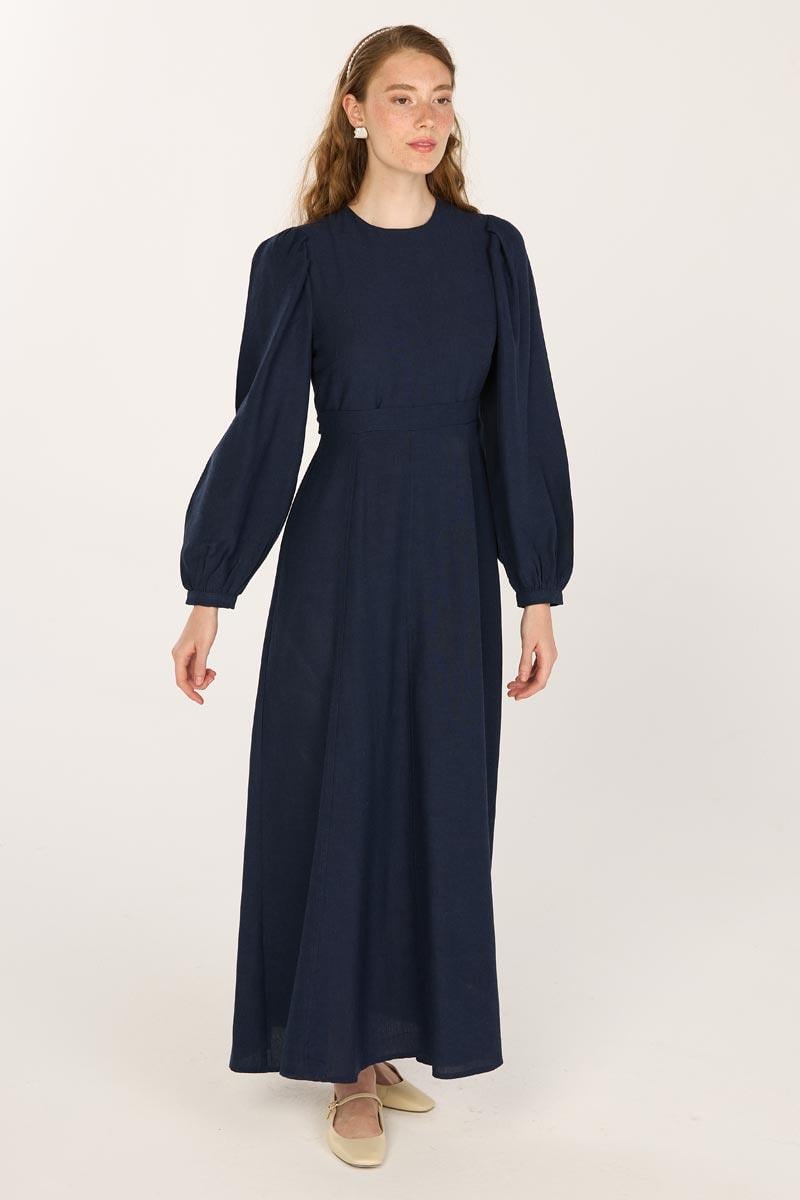 Keten Dokulu Parçalı Elbise Lacivert
