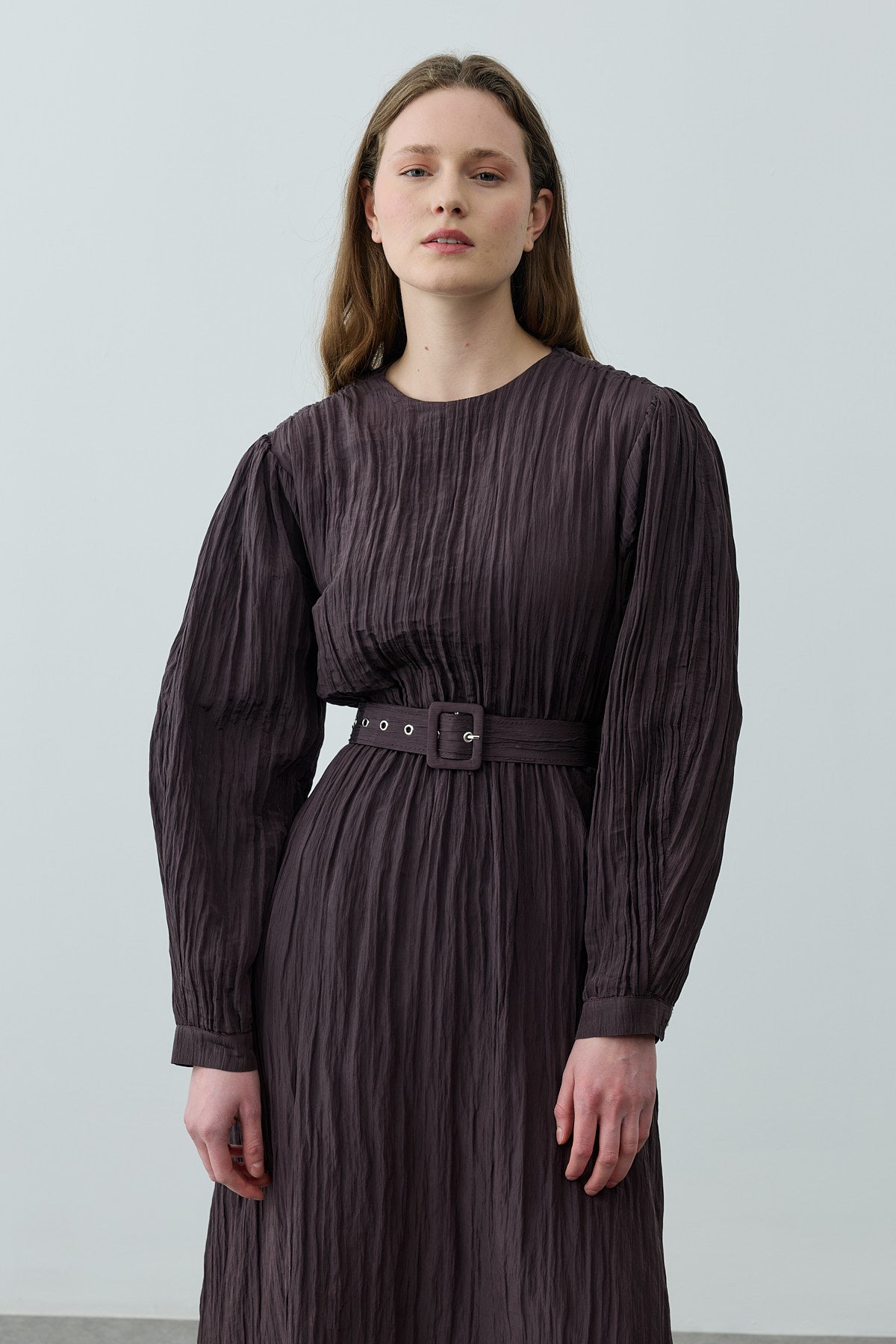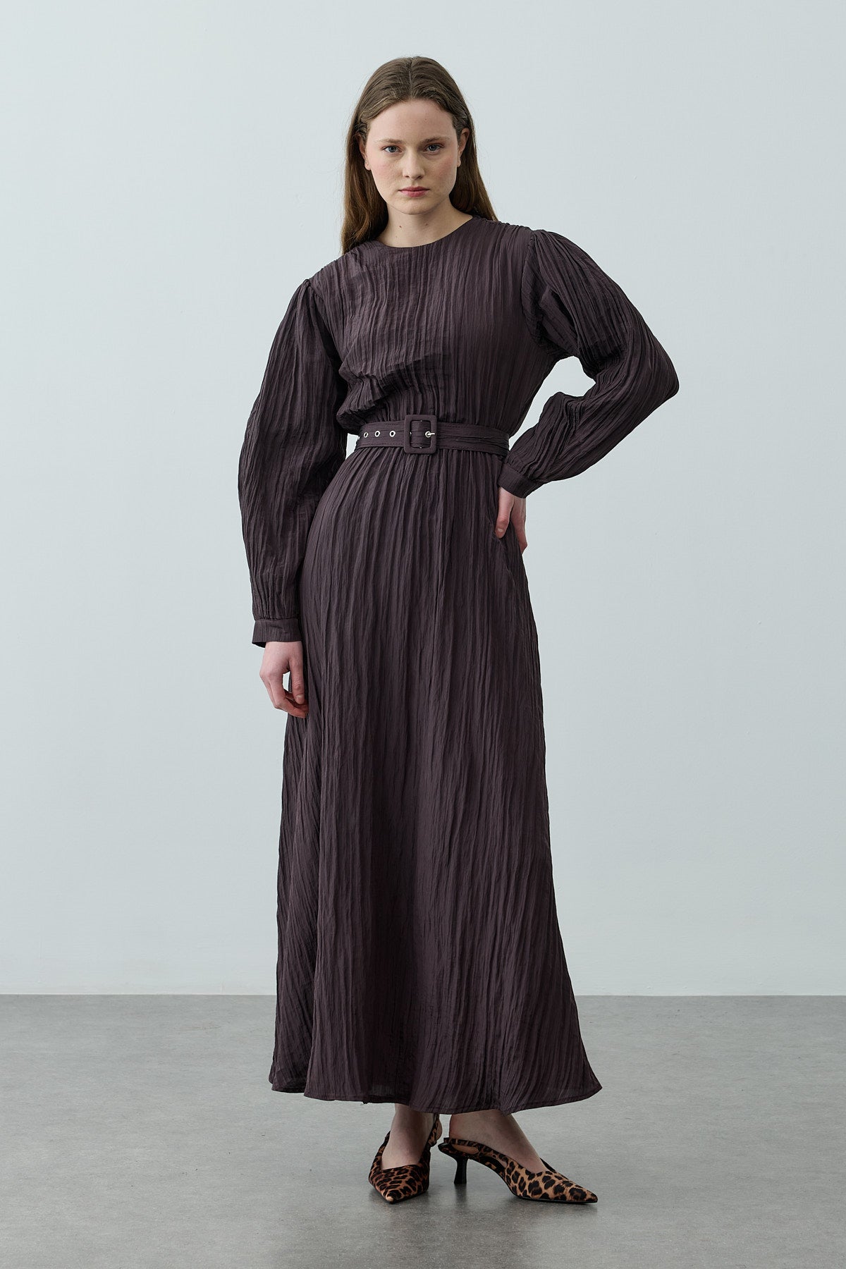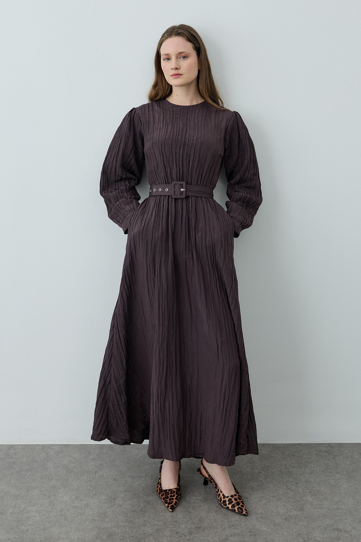 Kıraşlı Kaplama Kemerli Elbise Kahverengi