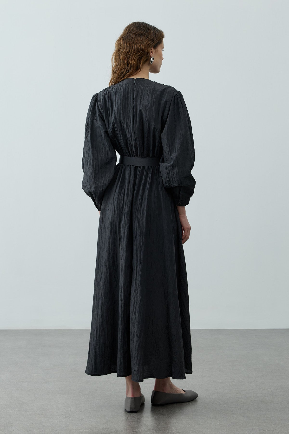 Hafif parlak kıraşlı dokuma kumaştan, bisiklet yakalı, sırtı fermuar kapamalı, uzun bomb kollu, beli ince lastikli, kendi kumaşından kaplama kemerli, maxi boy elbise.