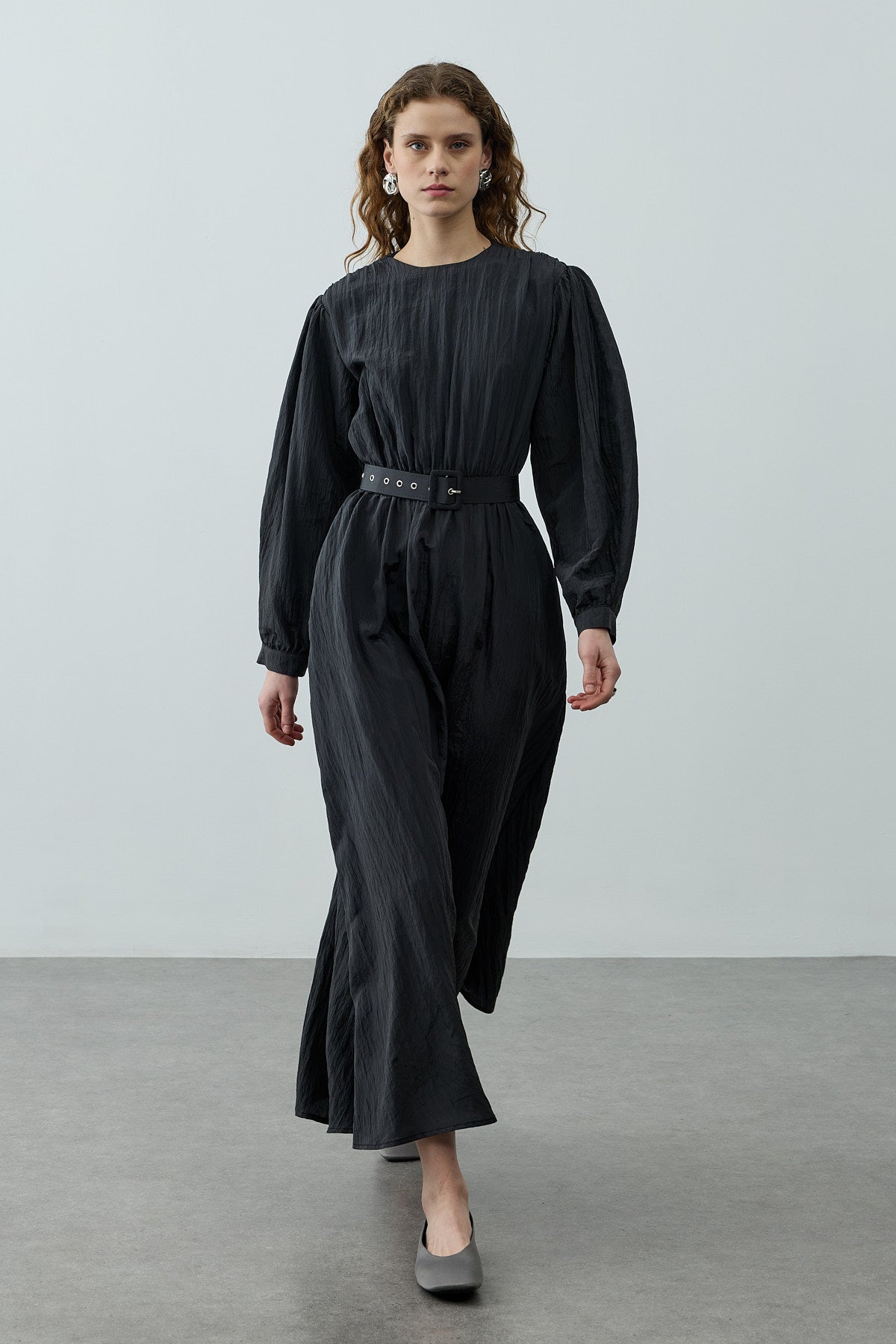 Kıraşlı Kaplama Kemerli Elbise Siyah