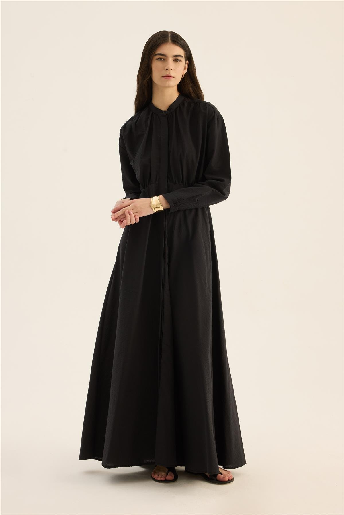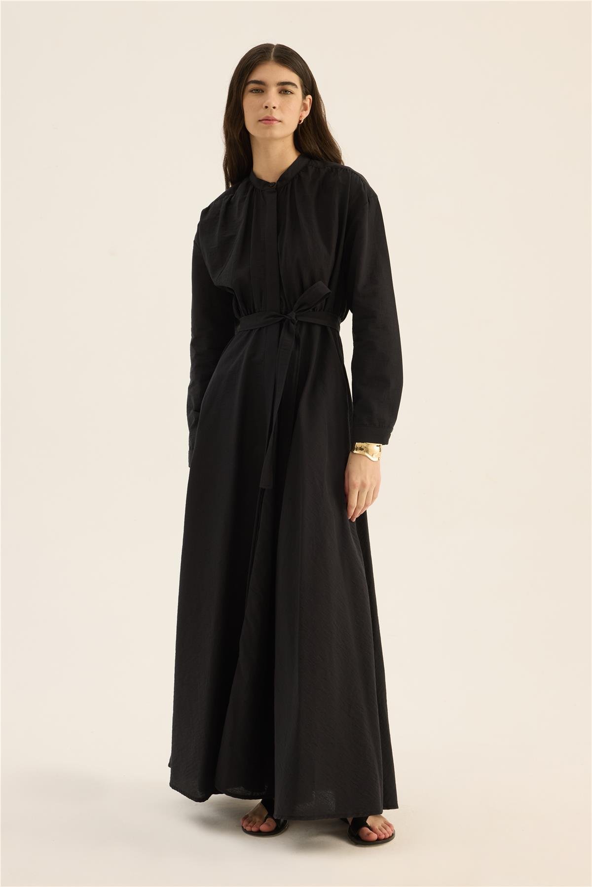 Minimal tasarımı ve zarif duruşu, elbiseyi sade ama etkileyici bir görünüm arayanlar için ideal kılar. Yuvarlak yaka detayı ve uzun kollu formu, elbiseye klasik bir hava katarken, düz renk tonu farklı aksesuarlarla kolayca kombinlenebilmesine imkân verir.