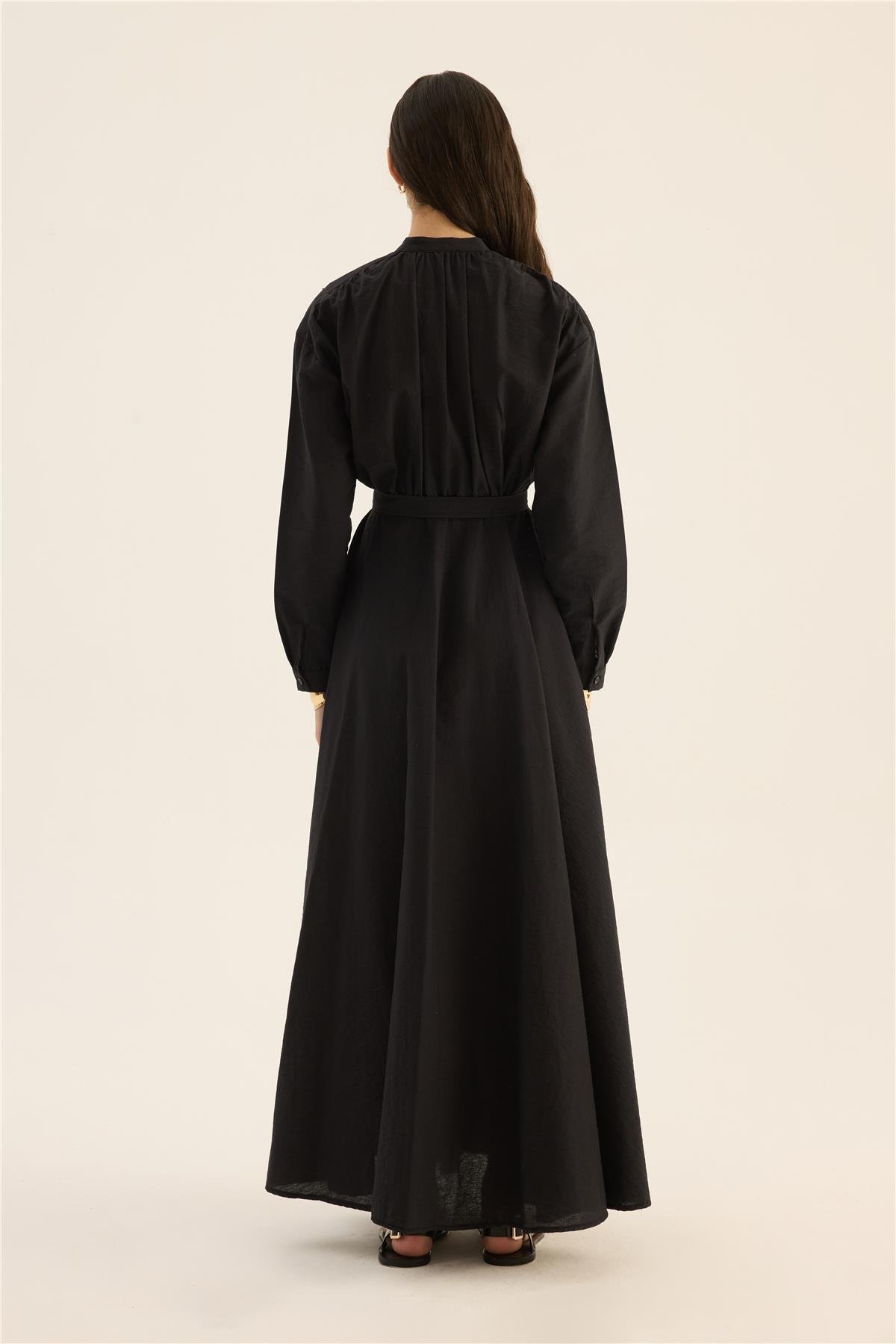 Doğal dokusu ve hafif kırışık yüzeyiyle dikkat çeken bu siyah elbise, %88 pamuk ve %12 polyester karışımı kumaştan üretilmiştir. Bel kısmındaki kemeri sayesinde vücuda zarif bir form kazandırırken, rahat kesimiyle gün boyu konfor sunar. Yaz sezonuna uygun yapısıyla hem günlük hem de özel gün kombinlerinde şık bir alternatif oluşturur.
