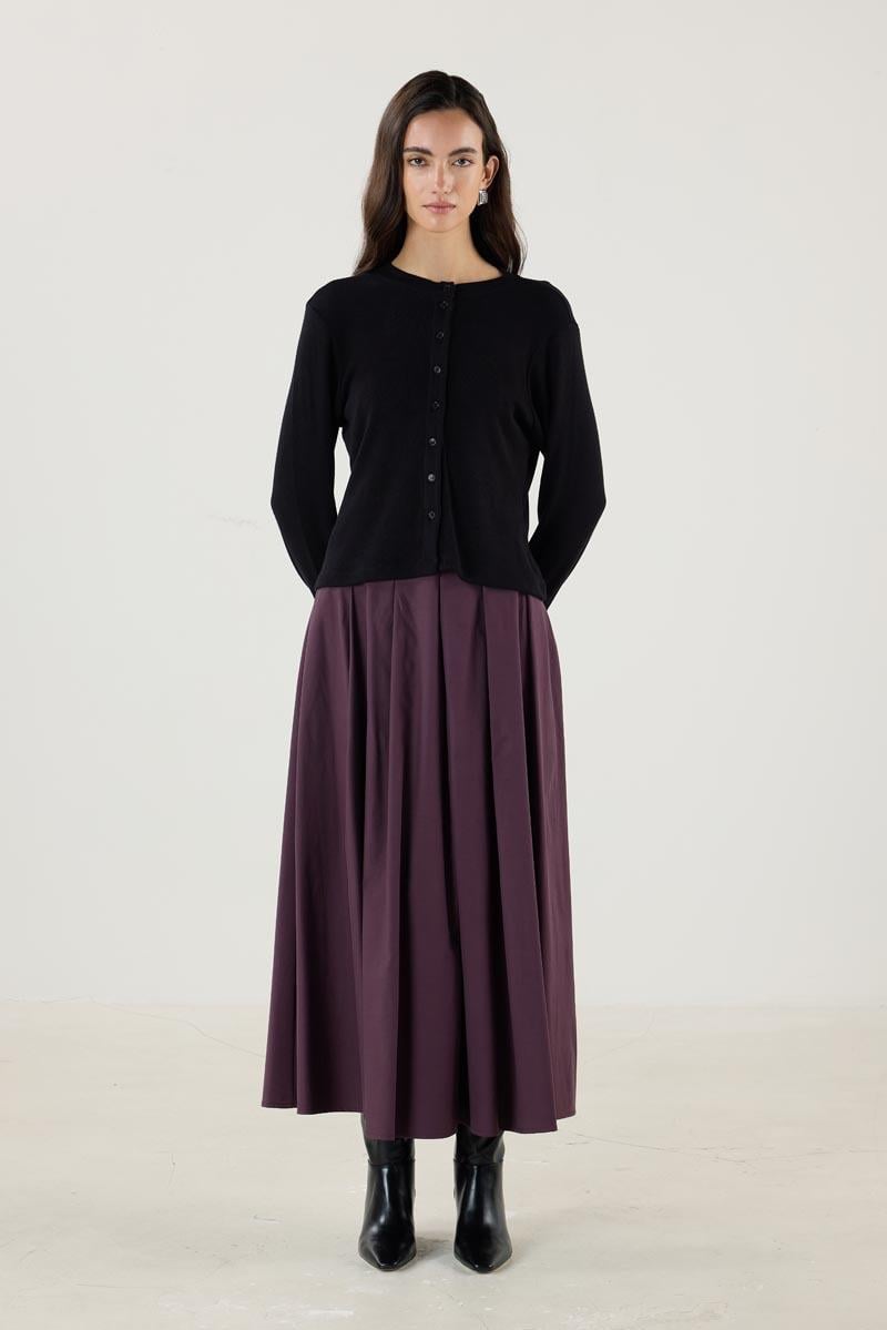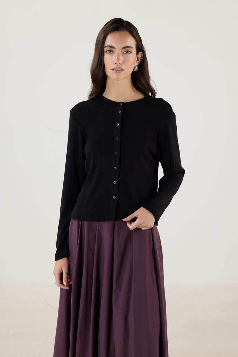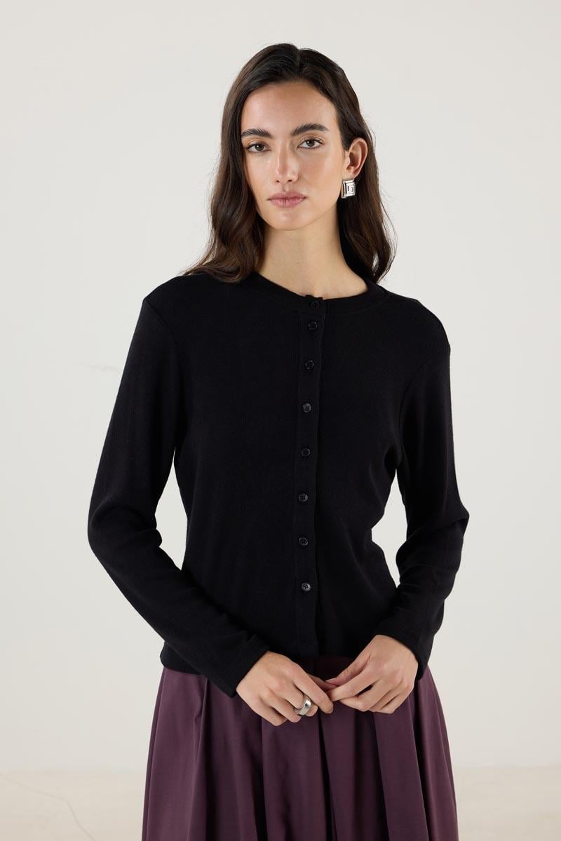 Bisiklet yaka, önden gold düğmeli ve cepli tüylü premium dokuda regular kesim hırka.