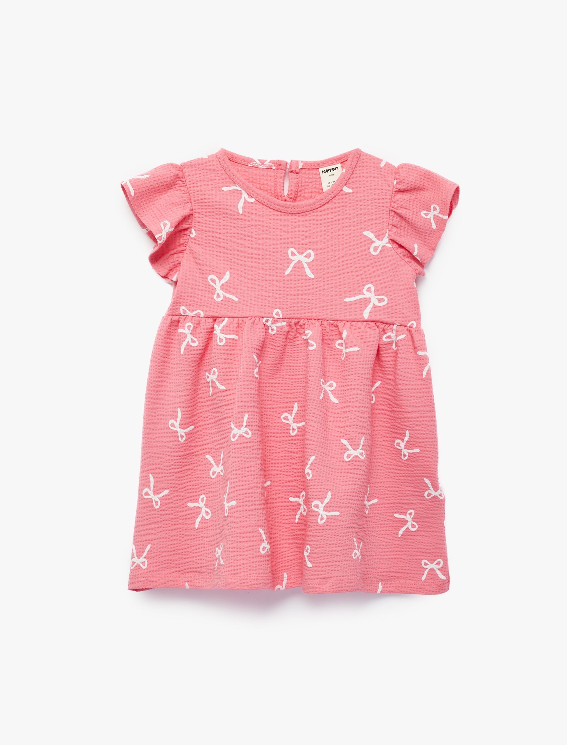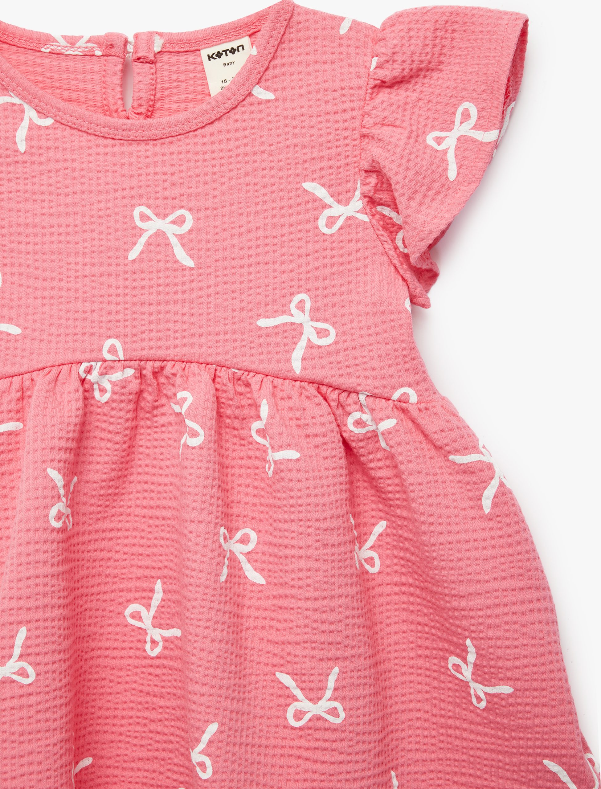 Kız Bebek Kısa Kollu Bisiklet Yaka Fiyonk Baskılı Pamuklu Elbise
