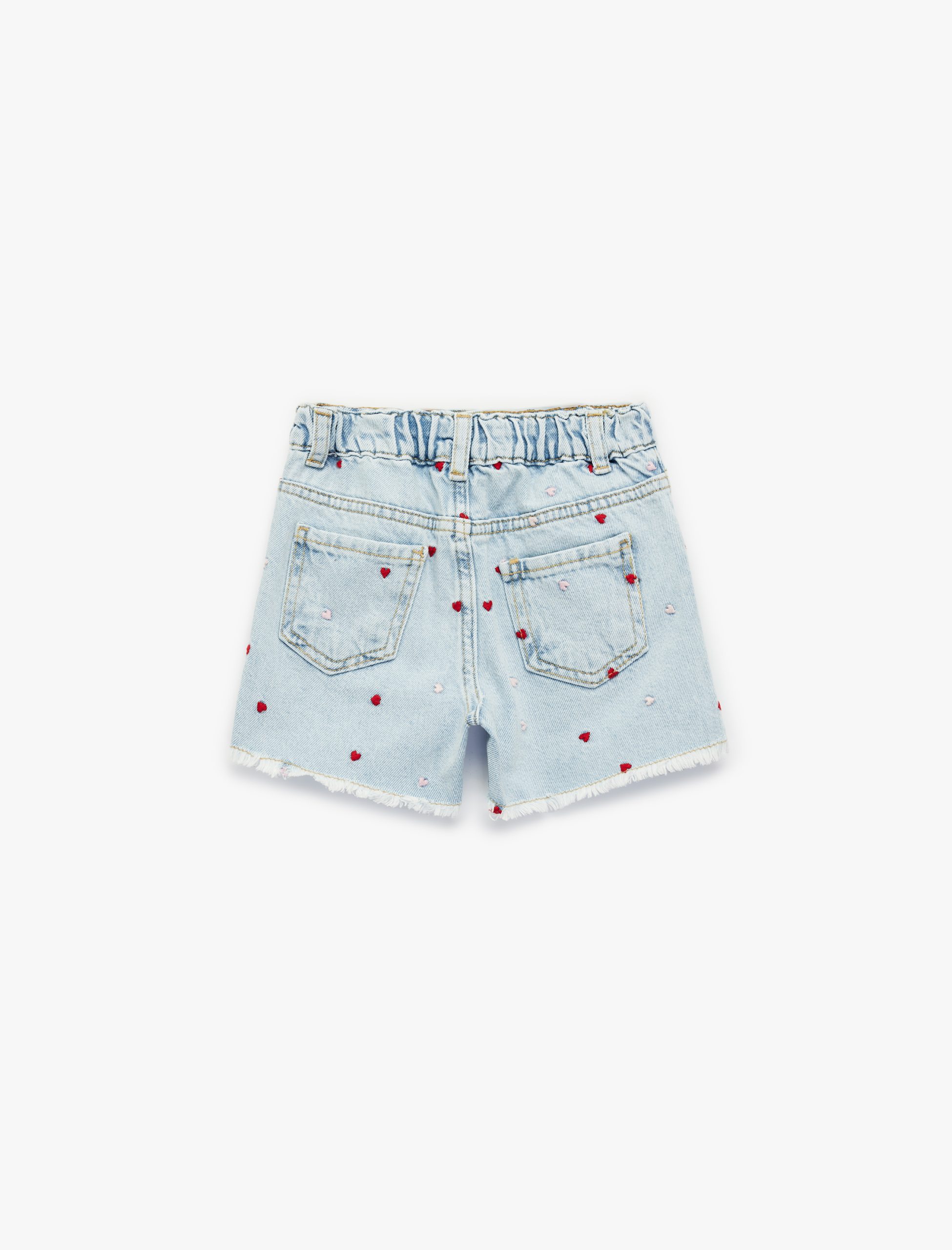 Kız Bebek Pamuklu Cepli Kalpli Nakışlı Denim Şort