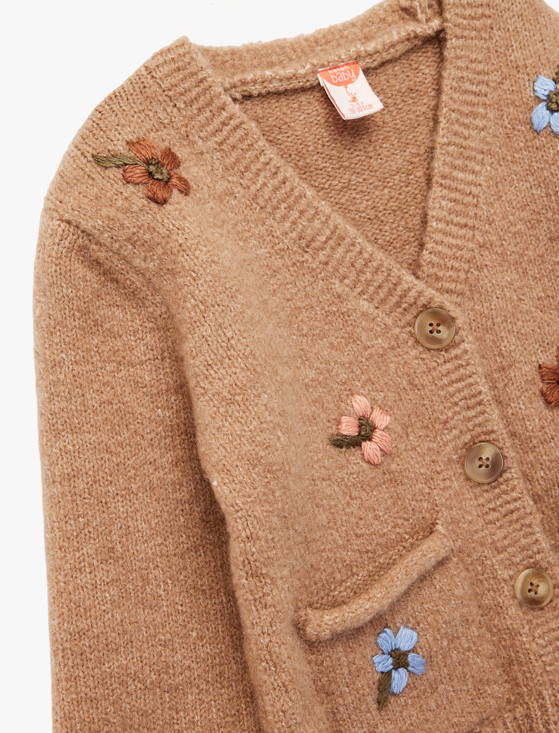 Sevimli hırka, yumuşak dokusuyla miniklere konfor sunuyor. V yaka tasarımı ve uzun kollu yapısıyla soğuk günlerde koruma sağlıyor. Çiçekli nakış detayları ise hırkaya tatlı bir hava katıyor. Düğmeli kapanışı sayesinde kolayca giyilip çıkarılabiliyor. Yün karışımlı kumaşıyla sıcak tutarken, şık ve rahat bir giyim deneyimi sunuyor.