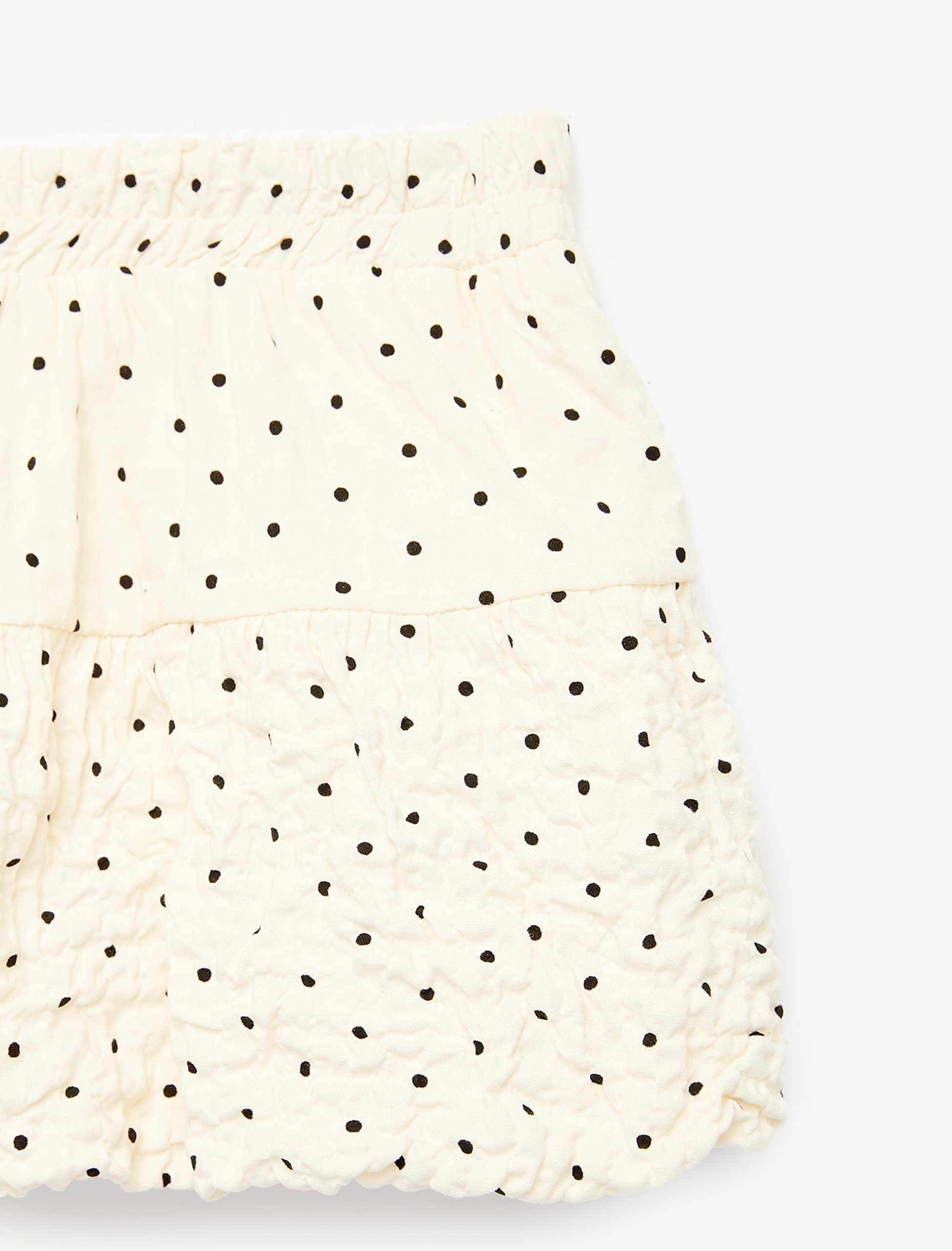 Puantiyeli etek, balon formuyla bebeklerin şirinliğini ön plana çıkarıyor. Rahat kesimi ile konforlu bir kullanım sunarken, puantiyeli desenleriyle dikkat çekiyor. Pamuk ve viskon karışımlı kumaşı ile gün boyu rahatlık sağlıyor.