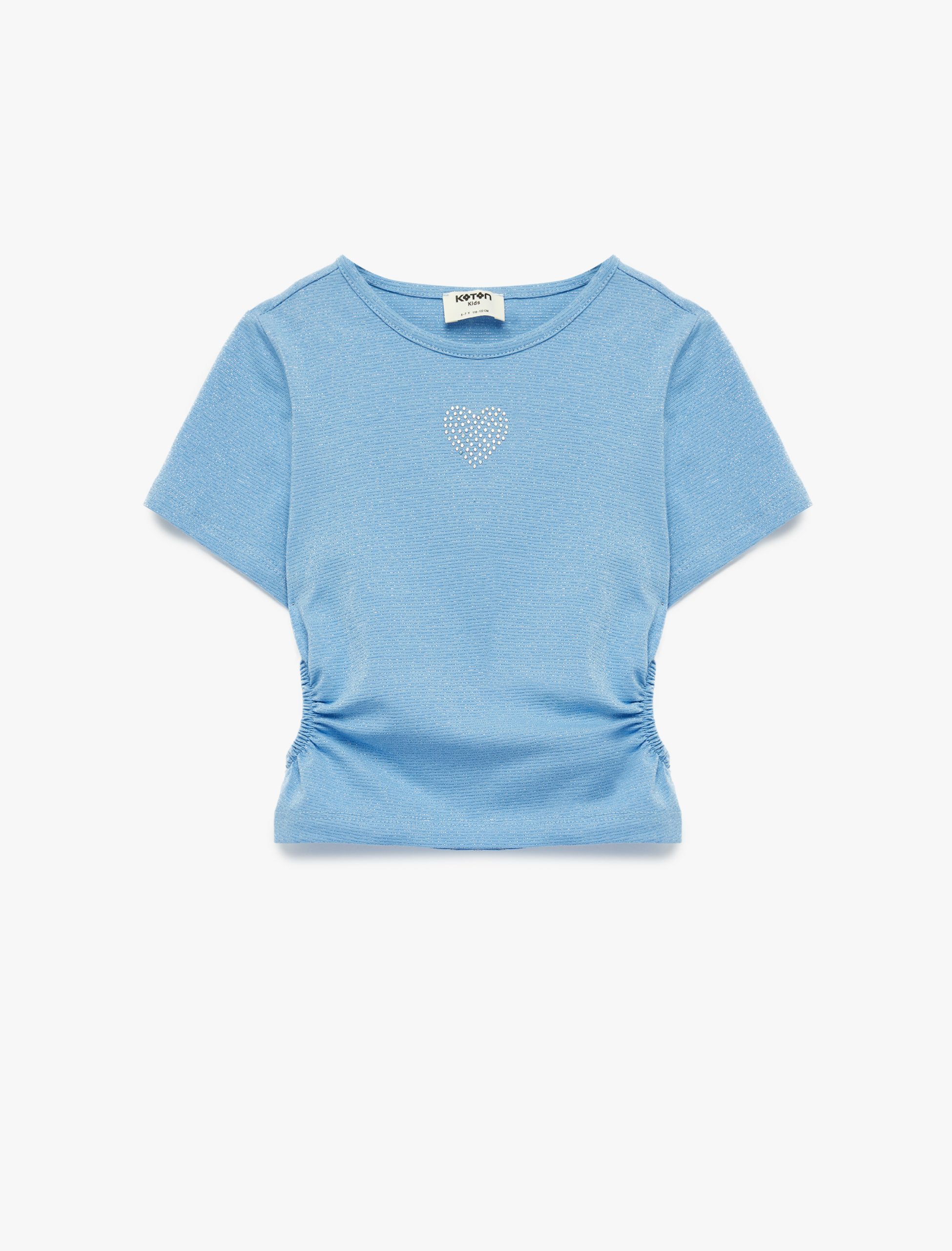 Kız Çocuk Bisiklet Yaka Slim Fit Kalpli Taşlı Büzgü Detaylı Pamuklu Kısa Kollu Crop Bluz