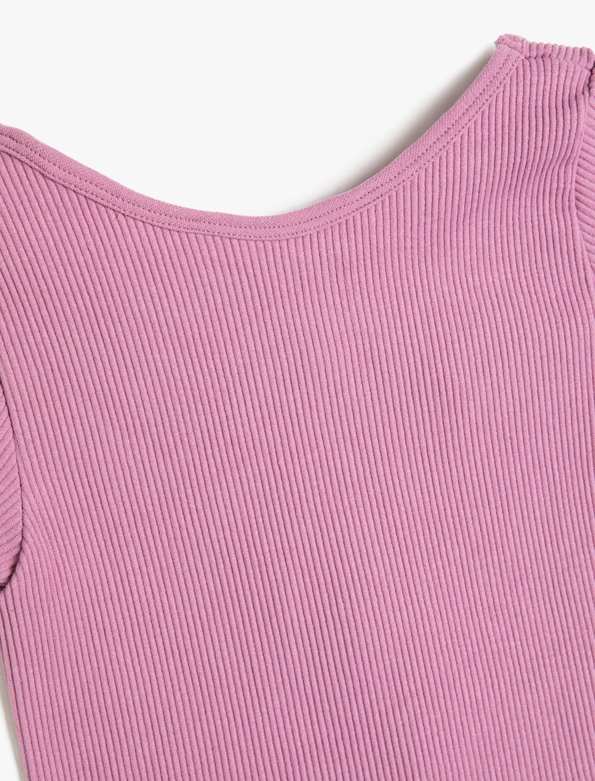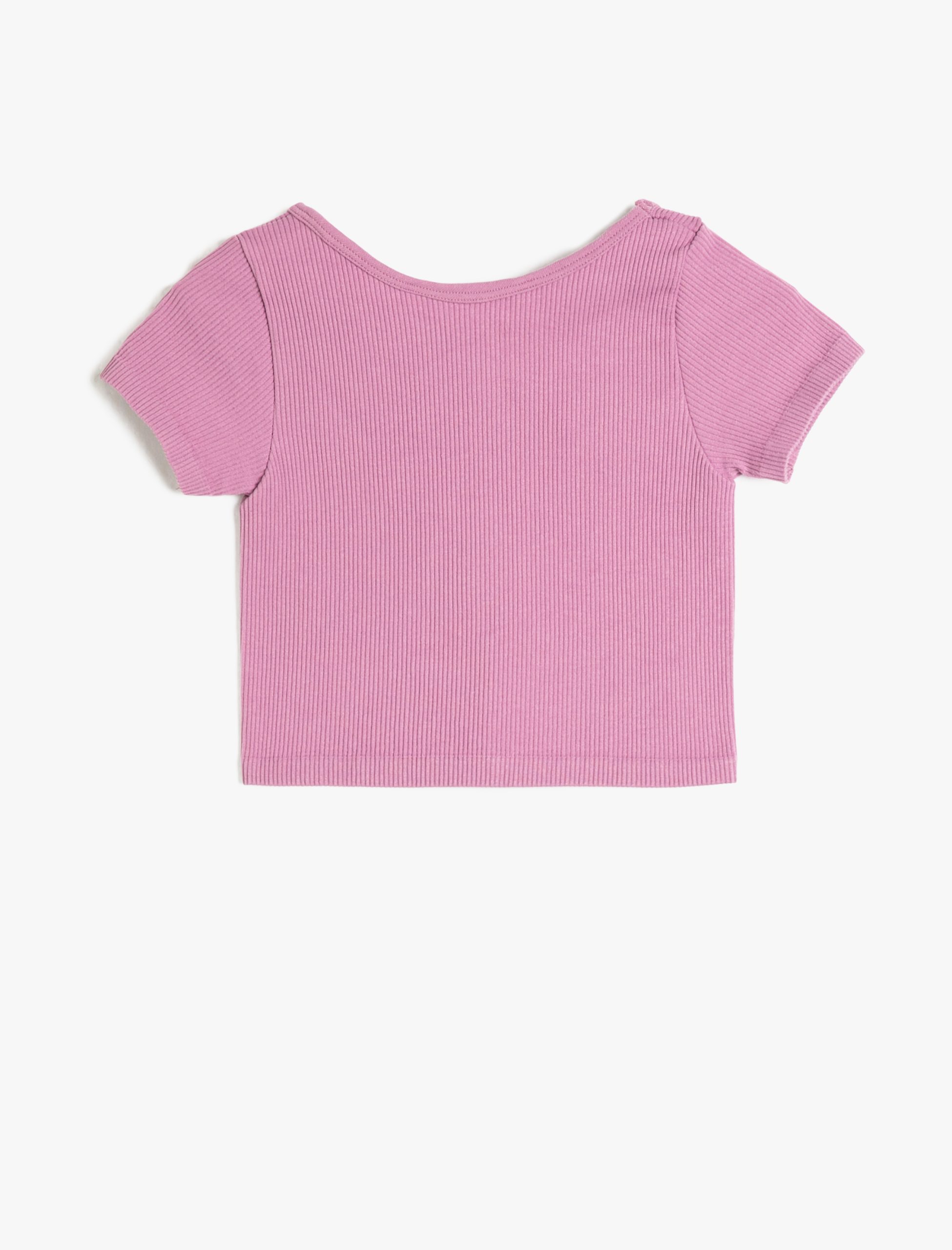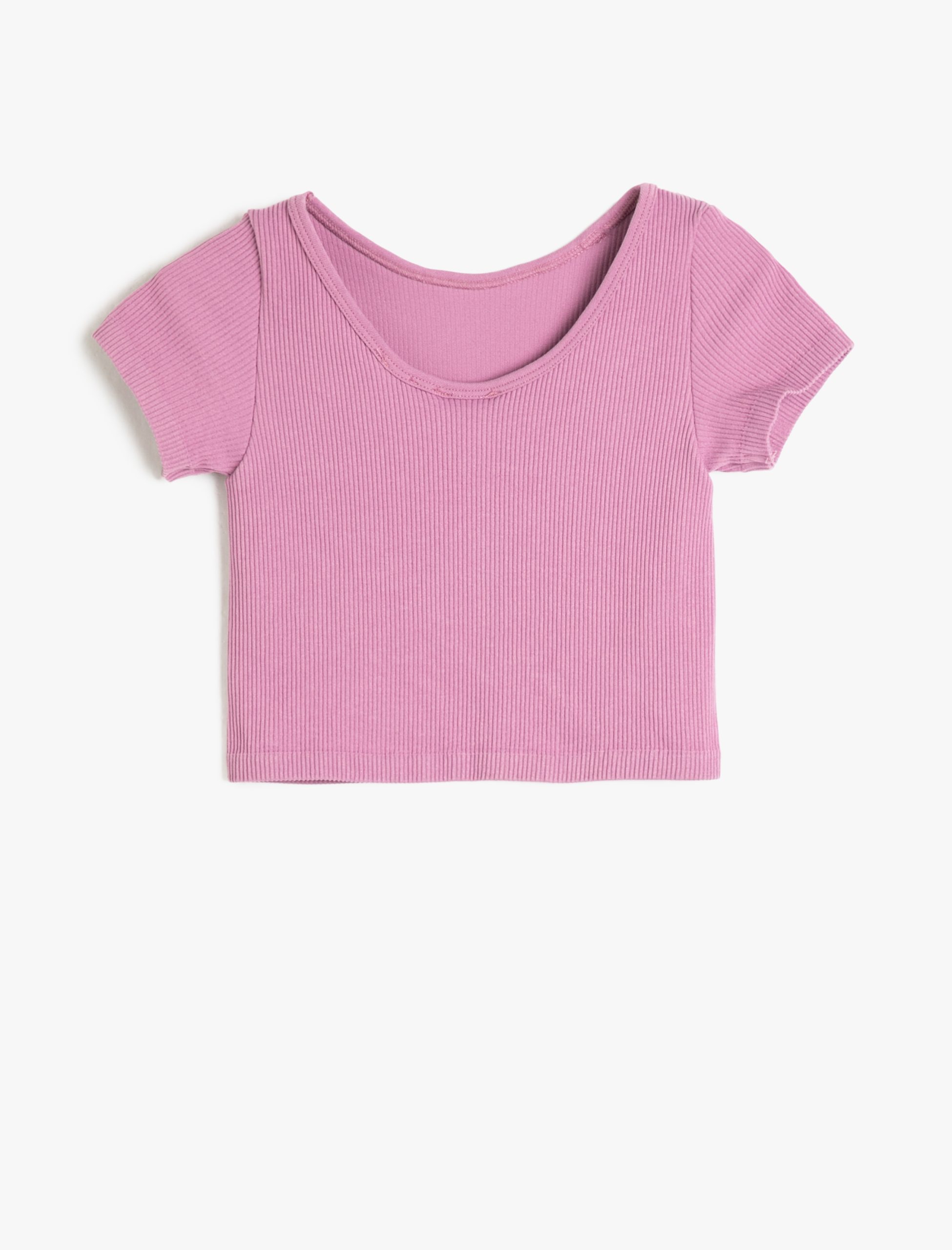 Kız Çocuk Crop Tişört Derin Yuvarlak Yaka Kısa Kollu Ribanalı