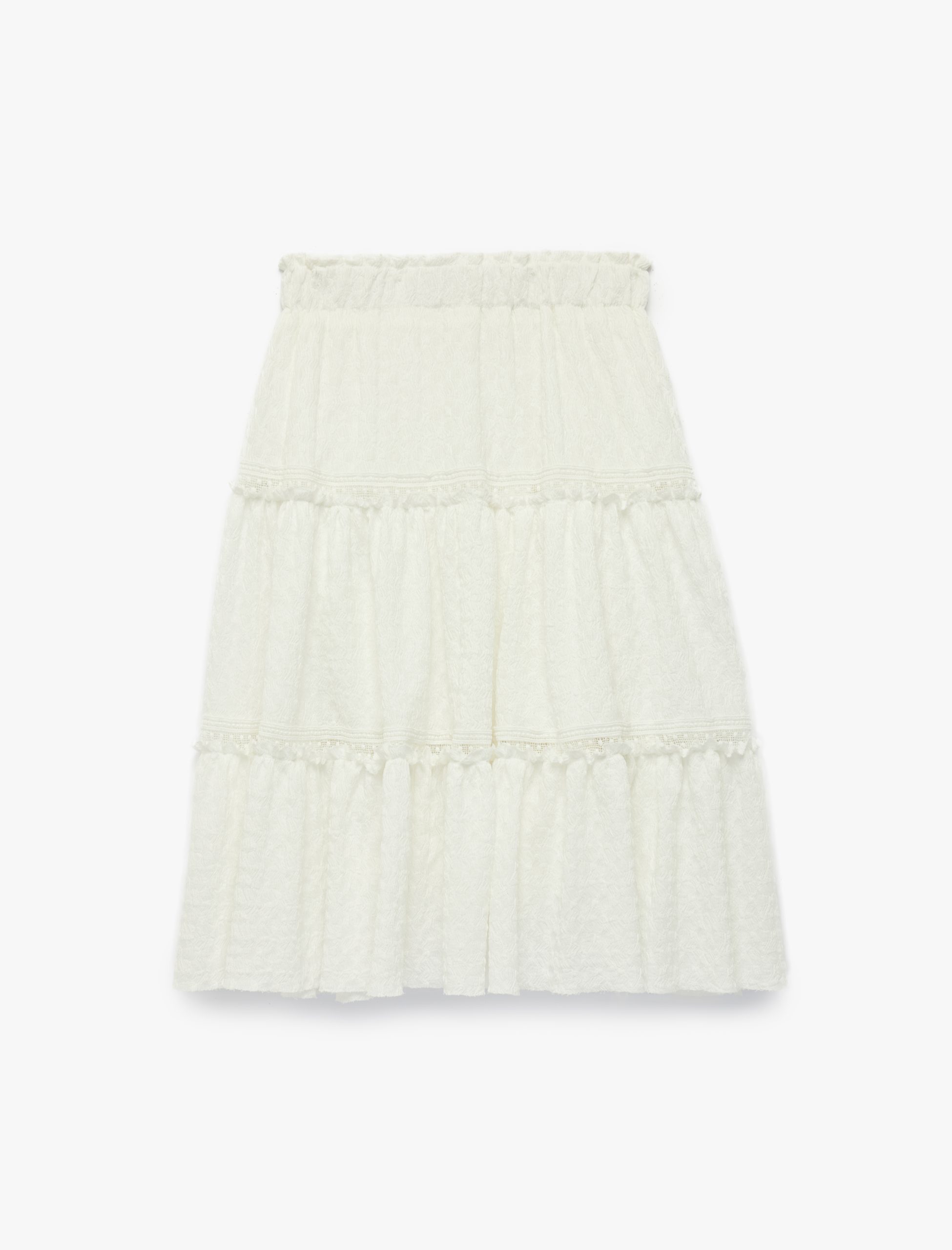 Dantel detaylı midi boy etek, A kesim tasarımıyla konfor sunuyor. Bürümcük yapısı eteğe modern bir dokunuş katarken, lastikli bel yapısı ile rahat bir giyim sağlıyor. Kat detaylı midi etek, sevimli detaylarıyla çocukların favorisi olmaya aday.