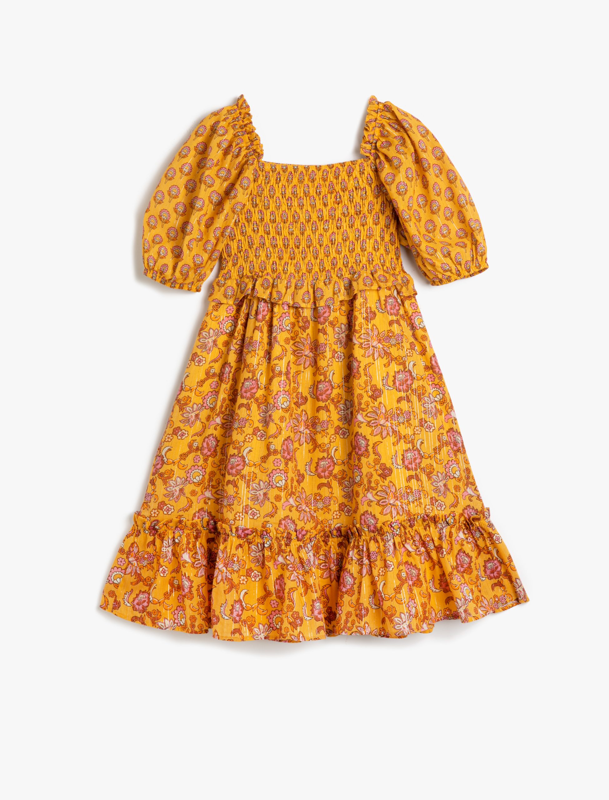 Kız Çocuk Elbise Çiçekli Balon Kollu Pamuklu Kare Yaka Astarlı