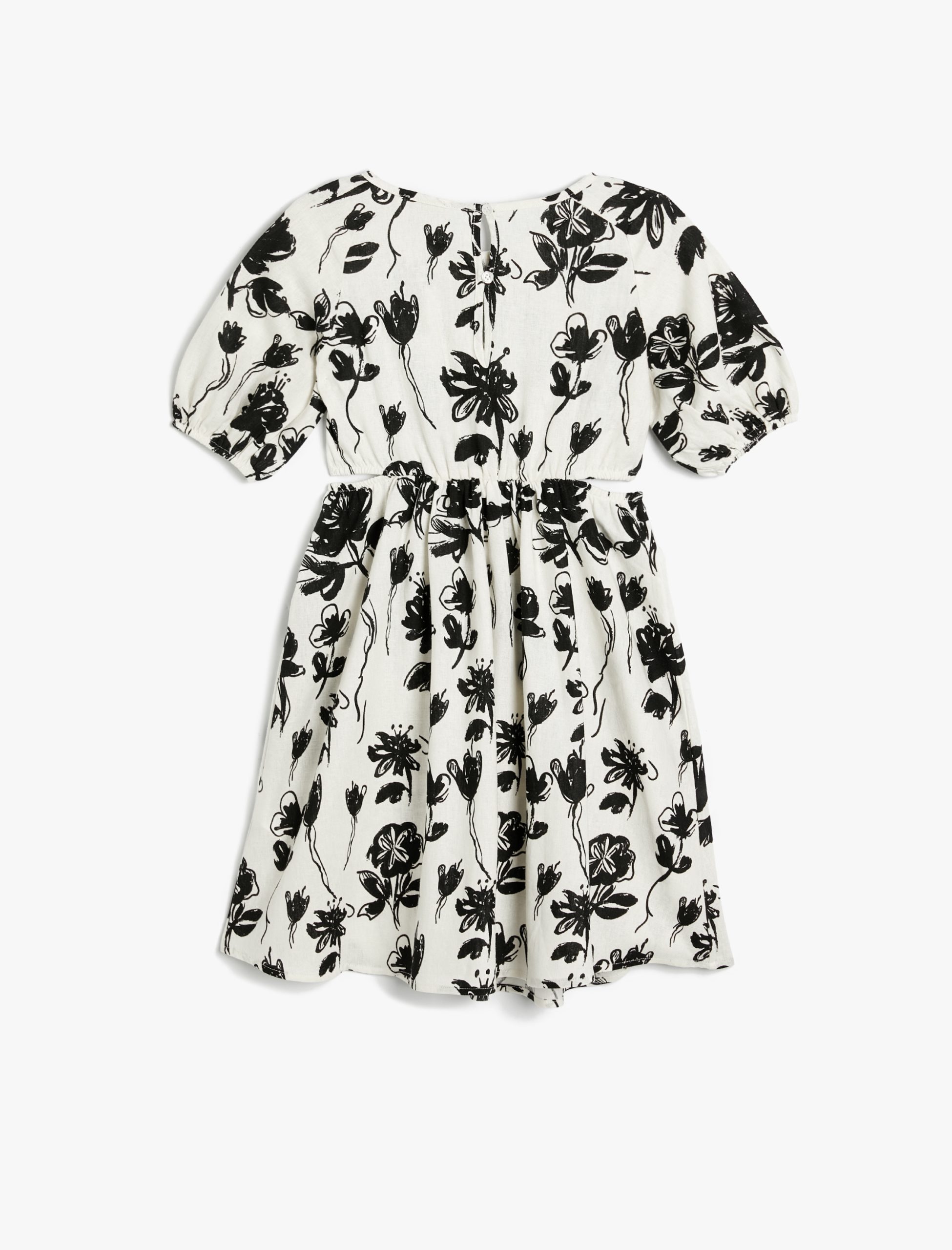 Kız Çocuk Keten Elbise Çiçekli Balon Kollu Yuvarlak Yaka