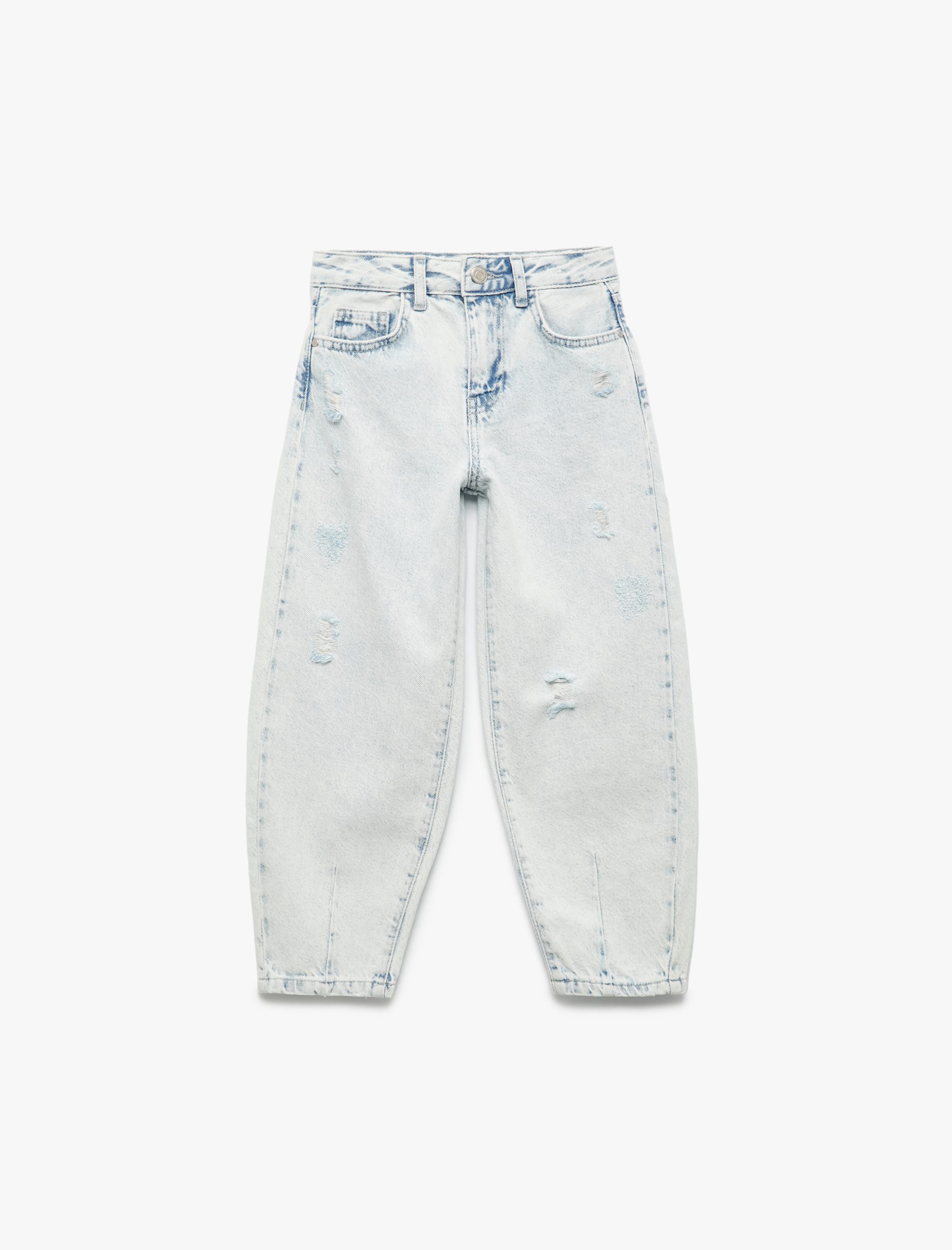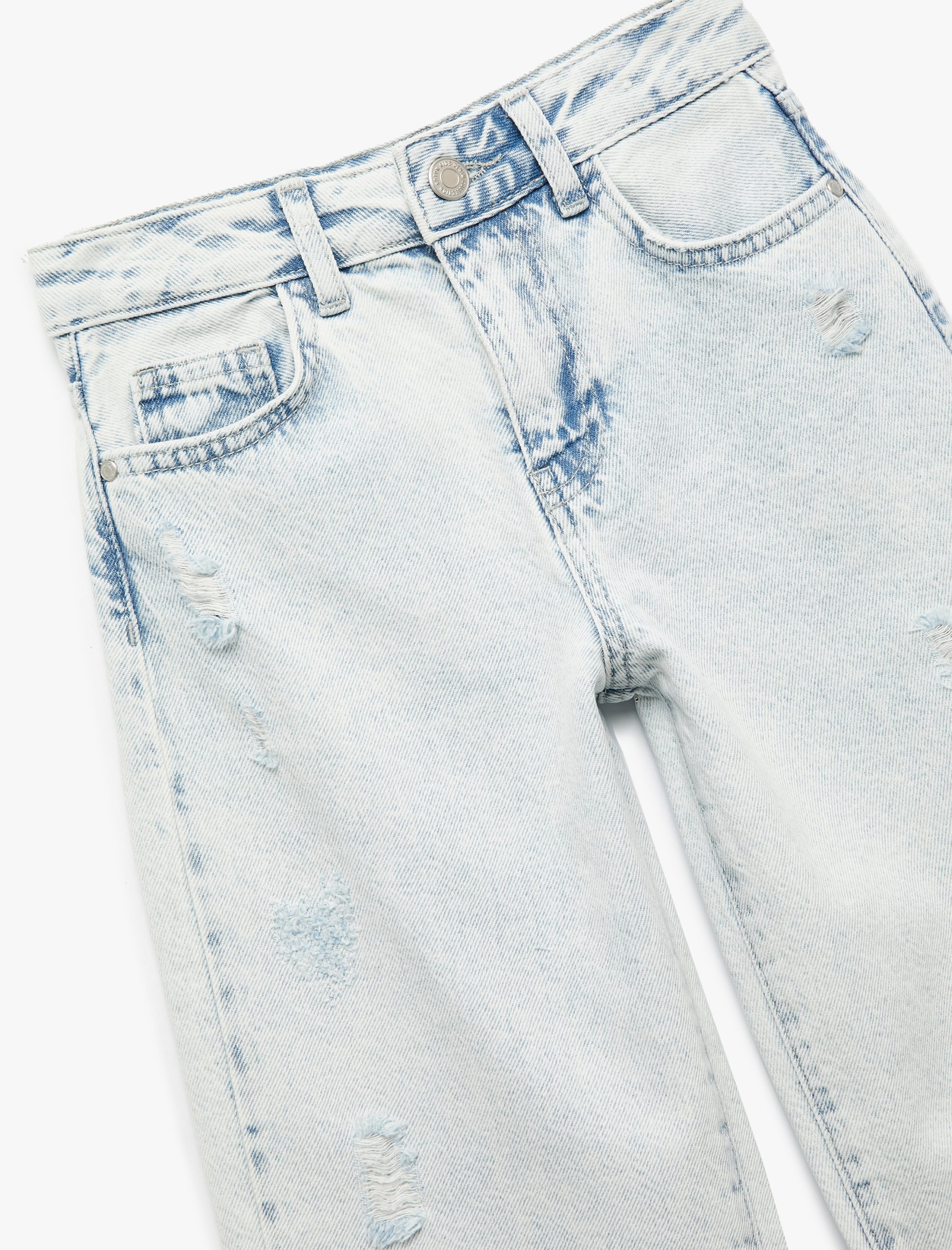 Paraşüt kesim denim pantolon, modern ve rahat bir görünüm sunuyor. Yıpratılmış detaylarıyla hareket kazanıyor. Pamuklu yapısı ve rahat kalıbıyla çocuklara gün boyu konfor sağlıyor.