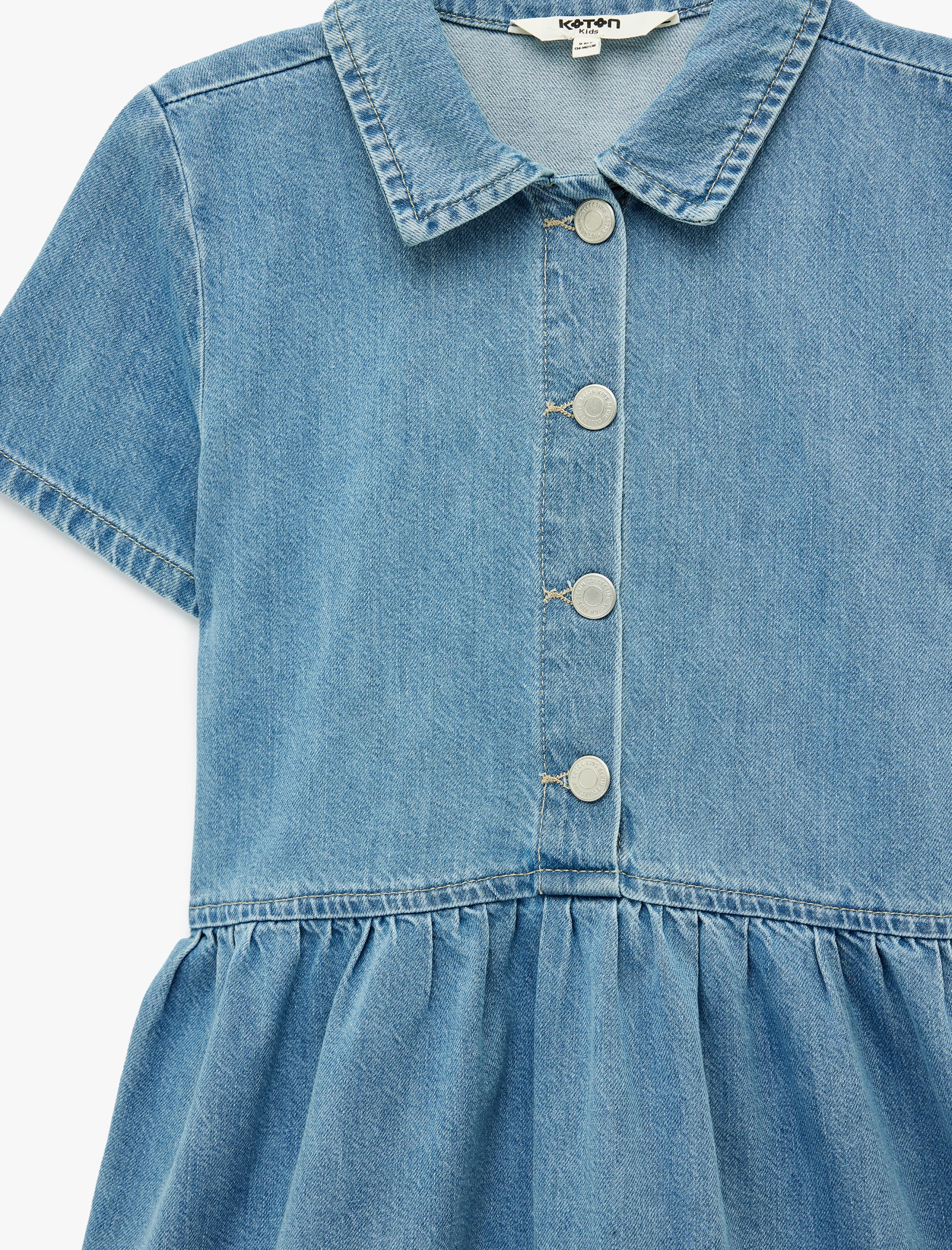 Kız Çocuk Pamuklu Düğmeli Kısa Kollu Gömlek Yaka Denim Elbise