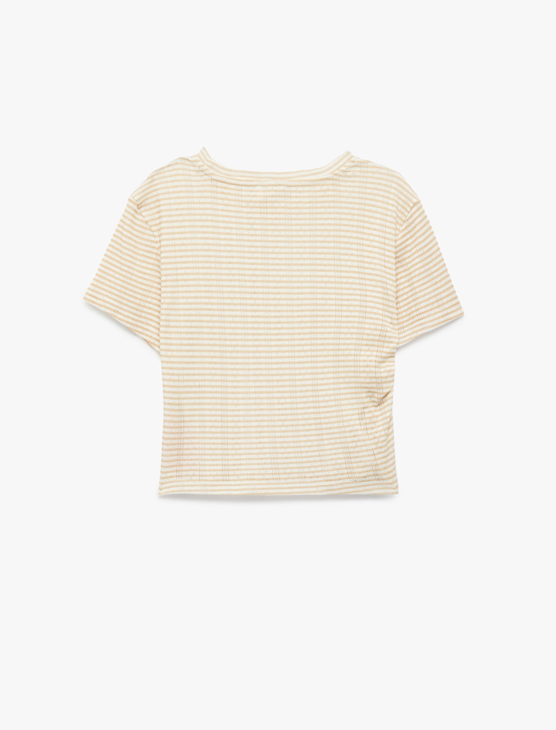 Kız Çocuk Pamuklu Slim Fit Kısa Kollu Bisiklet Yaka Yandan Büzgü Detaylı Çizgili Crop Tişört