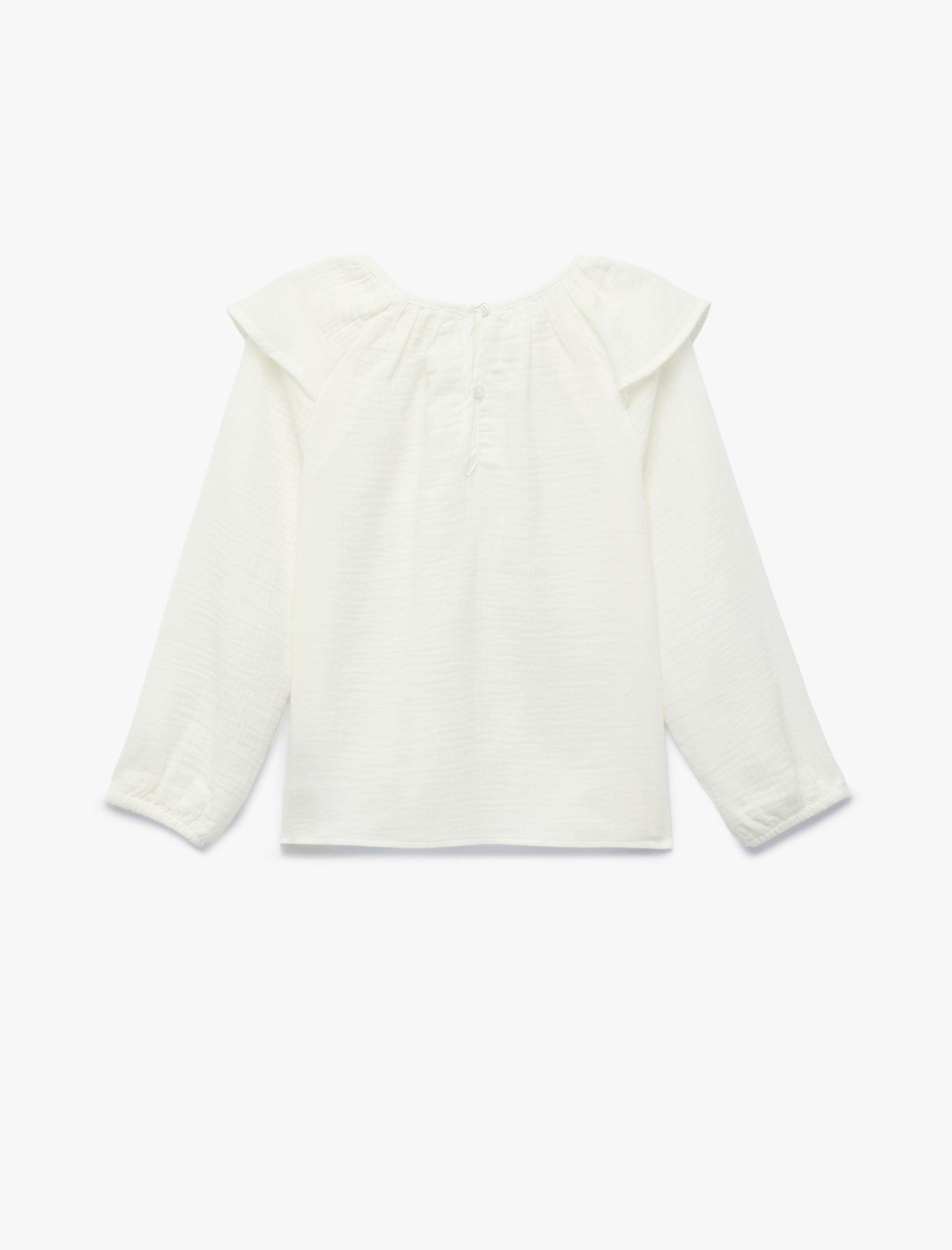 Pamuklu bluz, çocuklarının gardırobuna zarif bir dokunuş katıyor. Pamuklu dokusu ile gün boyu konfor sağlıyor. Uzun balon kolları ve geniş bisiklet yakası, şık bir görünüm sunarken, fırfır detayları tasarıma hareket katıyor. Pamuklu bluz, minikler için her mevsim tercih edilebilir bir parça sunuyor.