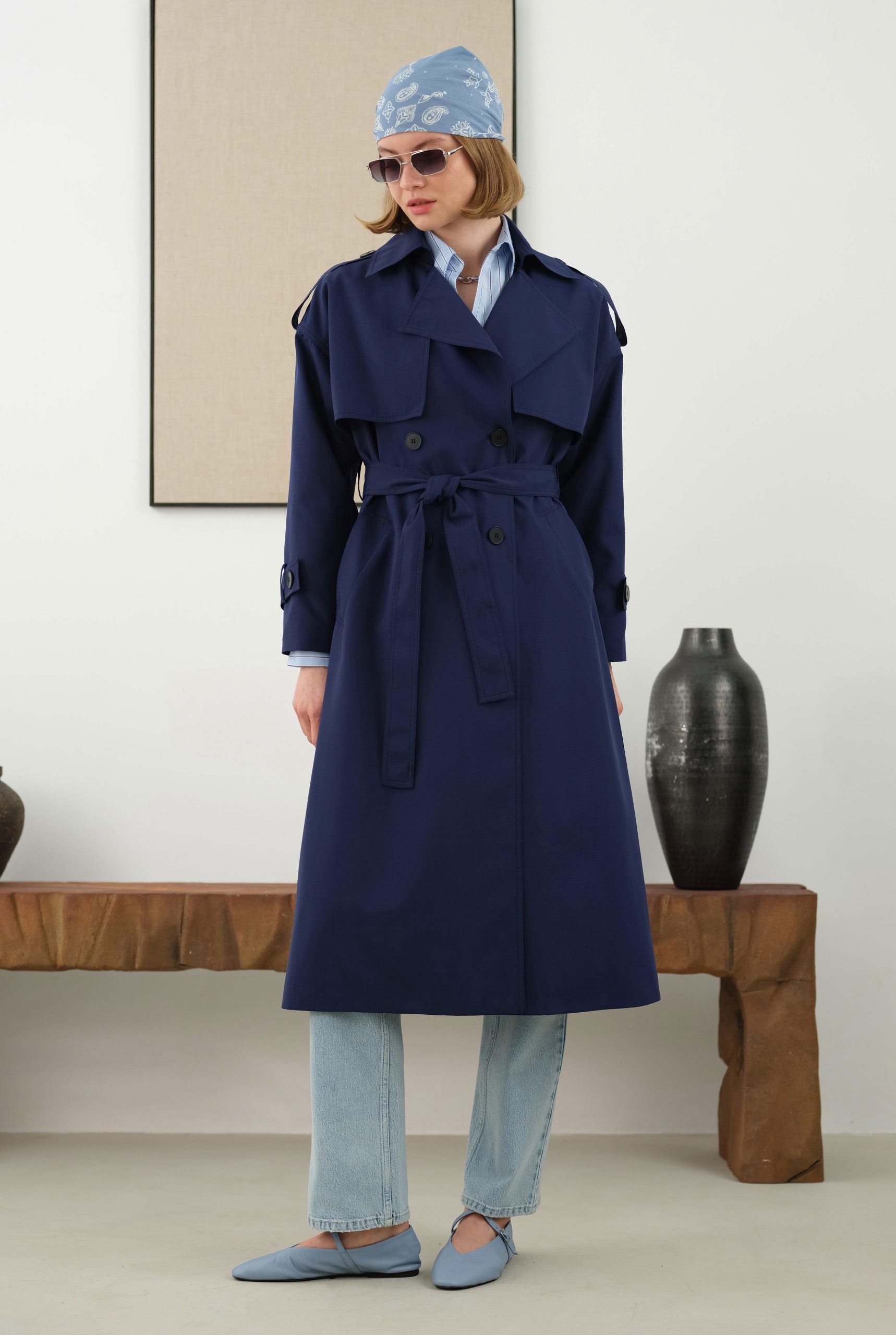 Klasik Uzun Trençkot Gece Mavisi