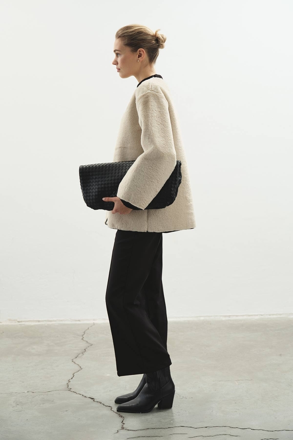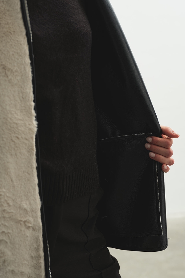 Bisiklet yaka, fermuar kapamalı, önden cepli, dikişli cep torbasına sahip isteğe bağlı dikkatlice açarak aktif hale kullanabilirsiniz, rahat kalıp, içi deri detaylı, astarsız kontrast deri biyeli pelüş mont.