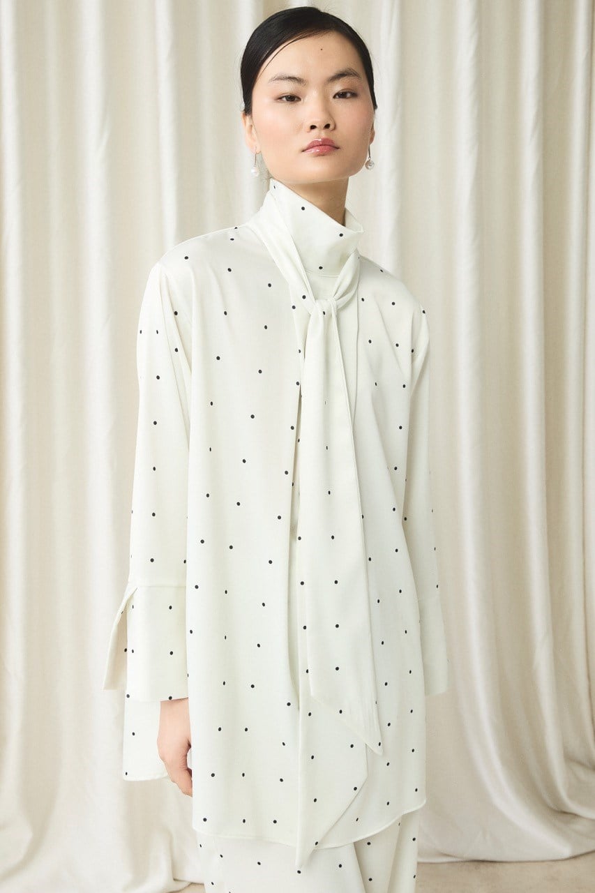 Kravat Yaka Puantiyeli Saten Takım – Ekru