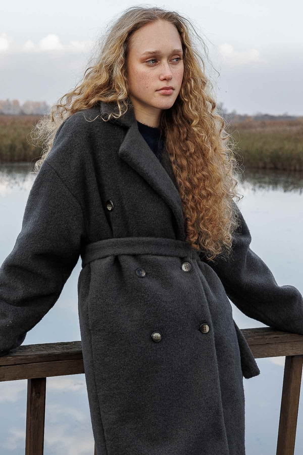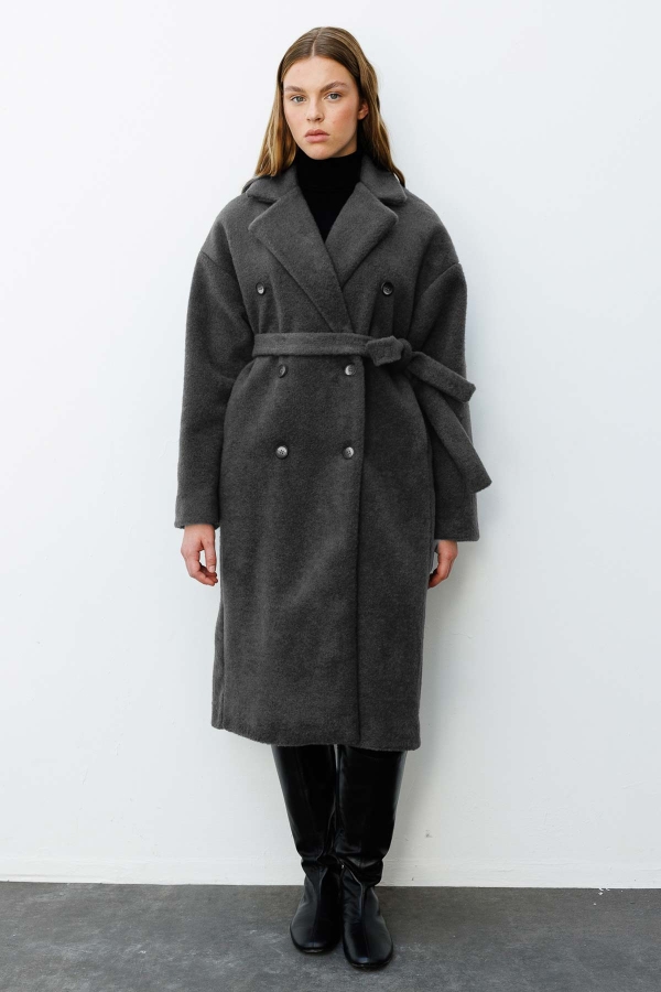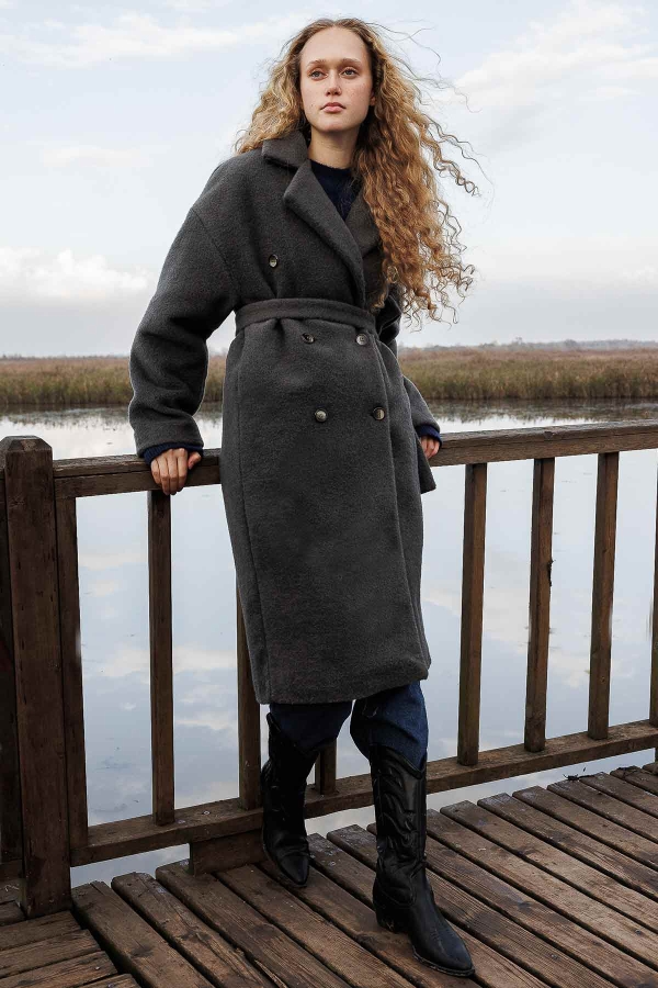 Kruvaze kapama, geniş yakalı, yanlardan cepli, oversize, yumuşak dokulu, premium astarlı kaban.