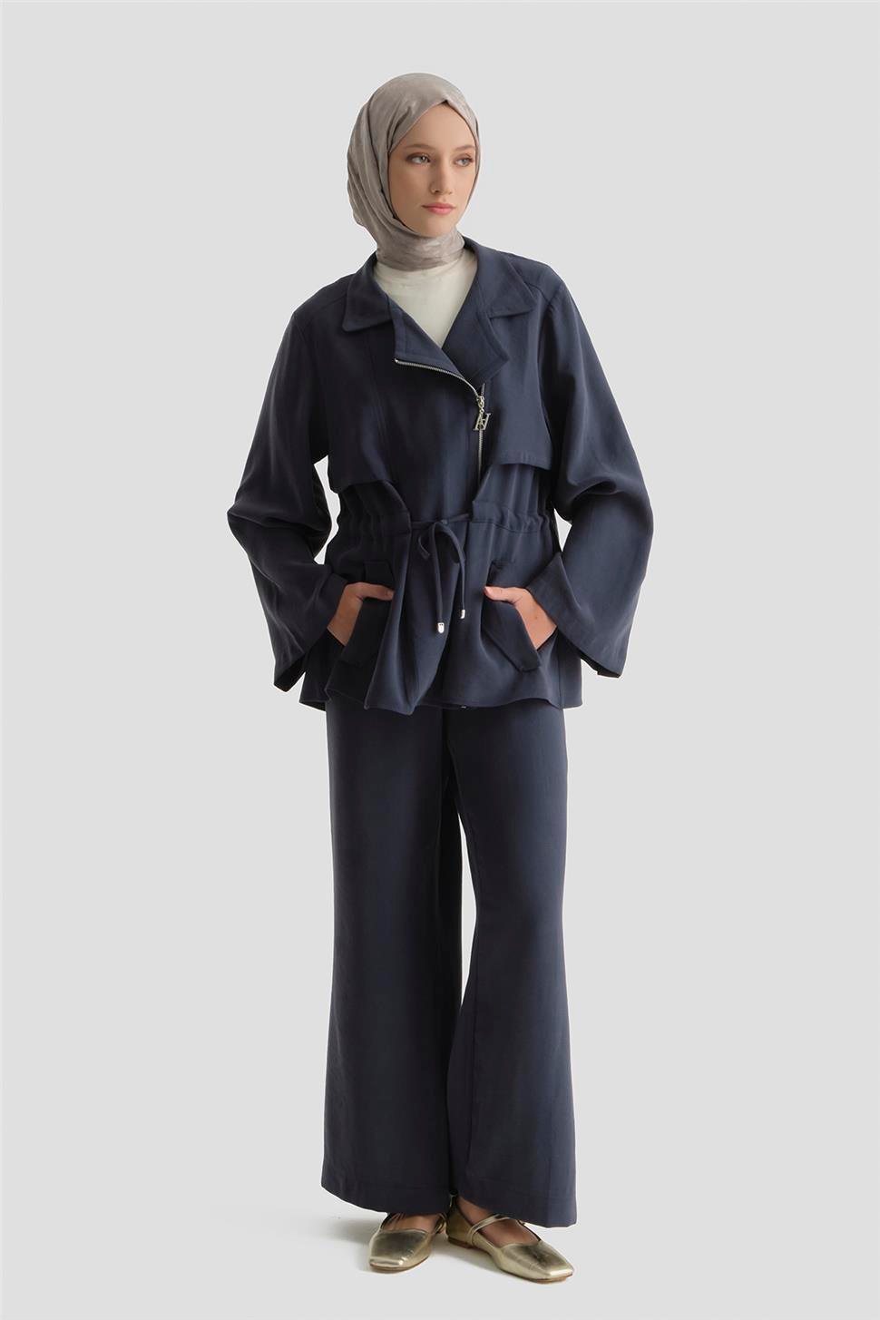 Modern terziliği akıcı kupra dokusuyla buluşturan bu takım, güçlü bir silueti zarif detaylarla dengeler. Fermuar kapamalı ceket formu ve belden ayarlanabilir yapısı tasarıma çağdaş bir karakter kazandırırken, geniş paça pantolon formu görünümü sofistike bir akışla tamamlar. Şehir stilinde rafine ve iddialı bir duruş arayanlar için zamansız bir seçimdir.