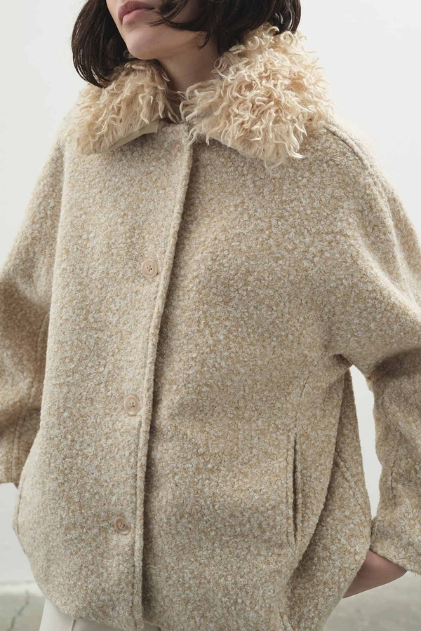 Tak – çıkar kürk yakalı, düğme kapamalı, cepli, düşük omuz, rahat kalıp, astarlı kürk yaka kısa mont.
