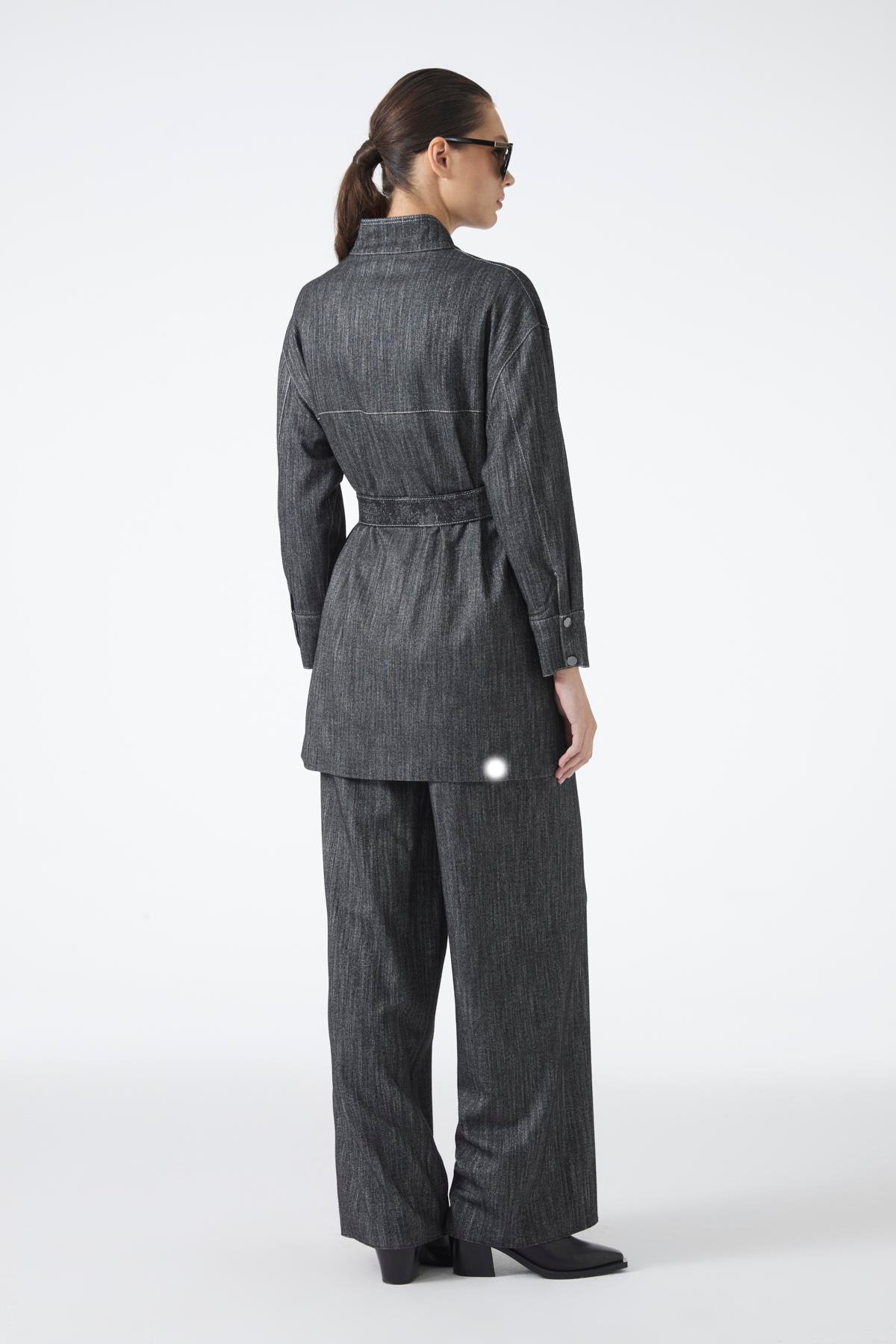 Ürün Detayları: Kuşaklı ceket, Düğme detaylı, Geniş paça pantolon, Rahat kalıp, Fermuarlı