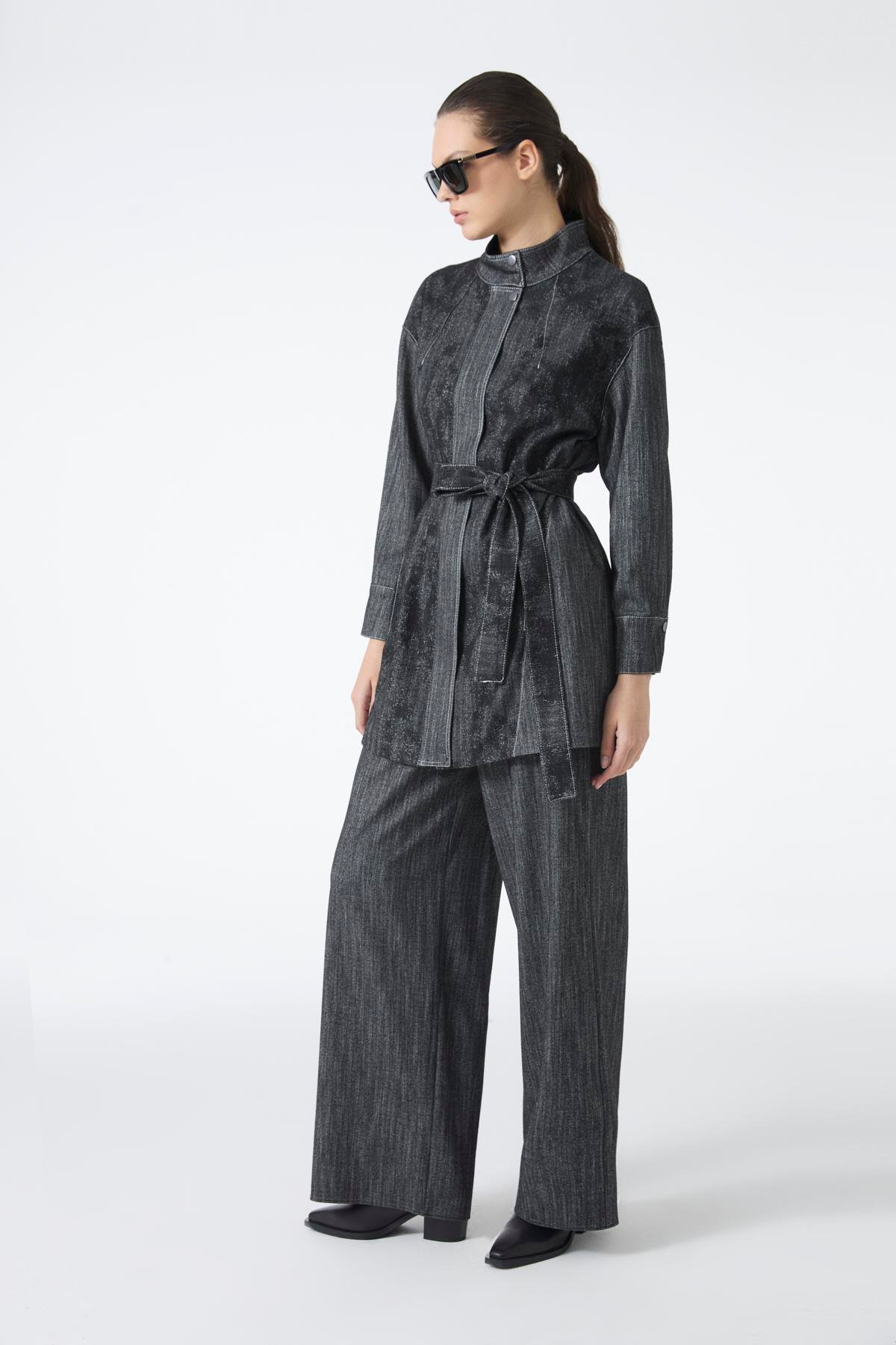 Siyah rengin zamansız şıklığını modern kesimle buluşturan bu ikili takım, kuşaklı ceket ve geniş paça pantolondan oluşur. Günlük kullanımdan özel davetlere kadar her stile uyum sağlayan bu takım, rahat kalıbıyla konforlu bir kullanım sunar.