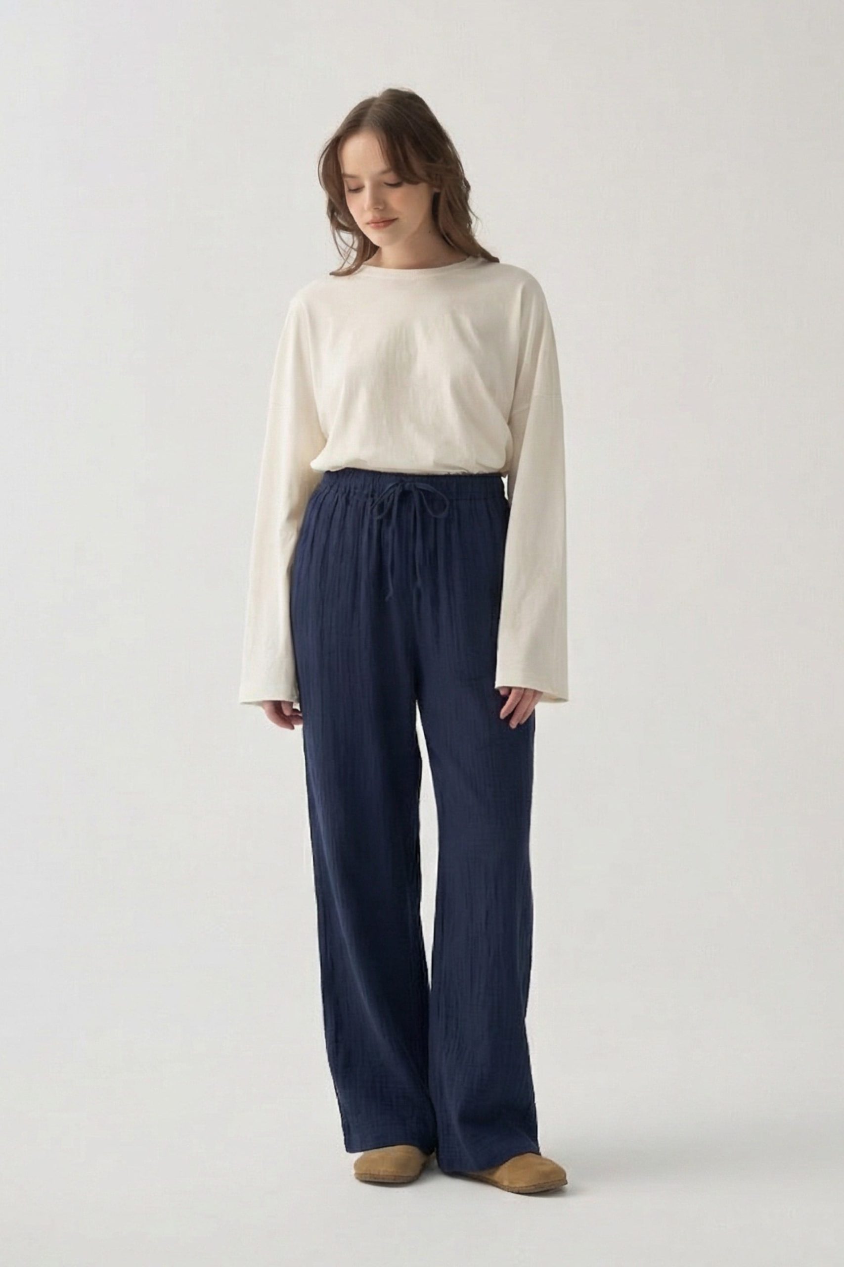 Şıklığı detaylarda arayanlara özel Lacivert-Beli Lastikli Müslin Pantolon ile zarif bir görünüm yakalayın. Günlük ve özel kombinler için ideal tasarım