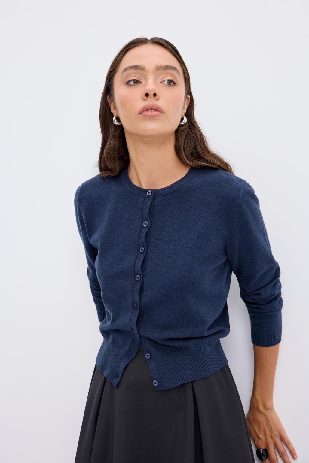 Lacivert Düğmeli Yuvarlak Yaka Örgü Hırka