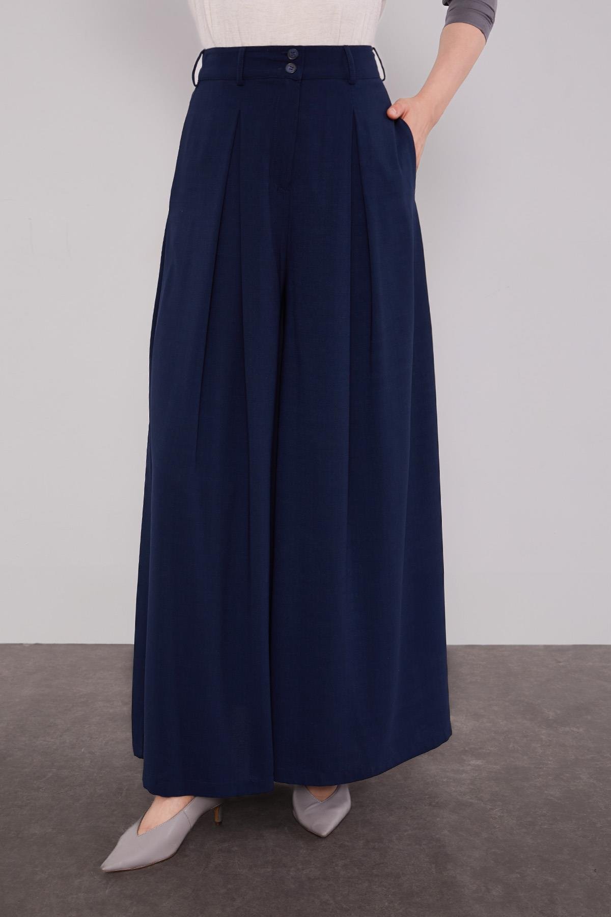Lacivert Geniş Paça Piliseli Pantolon Etek