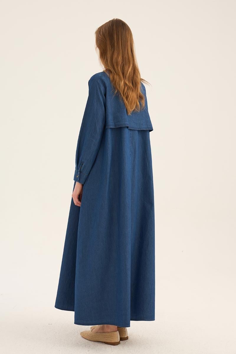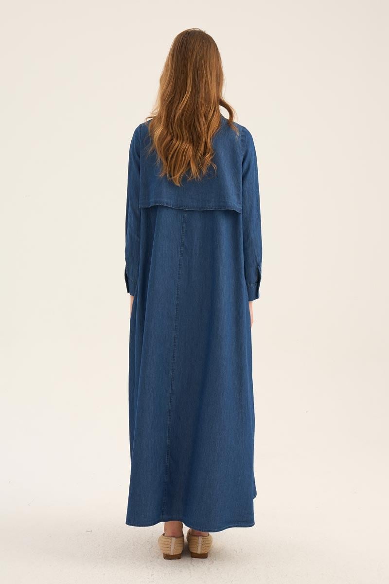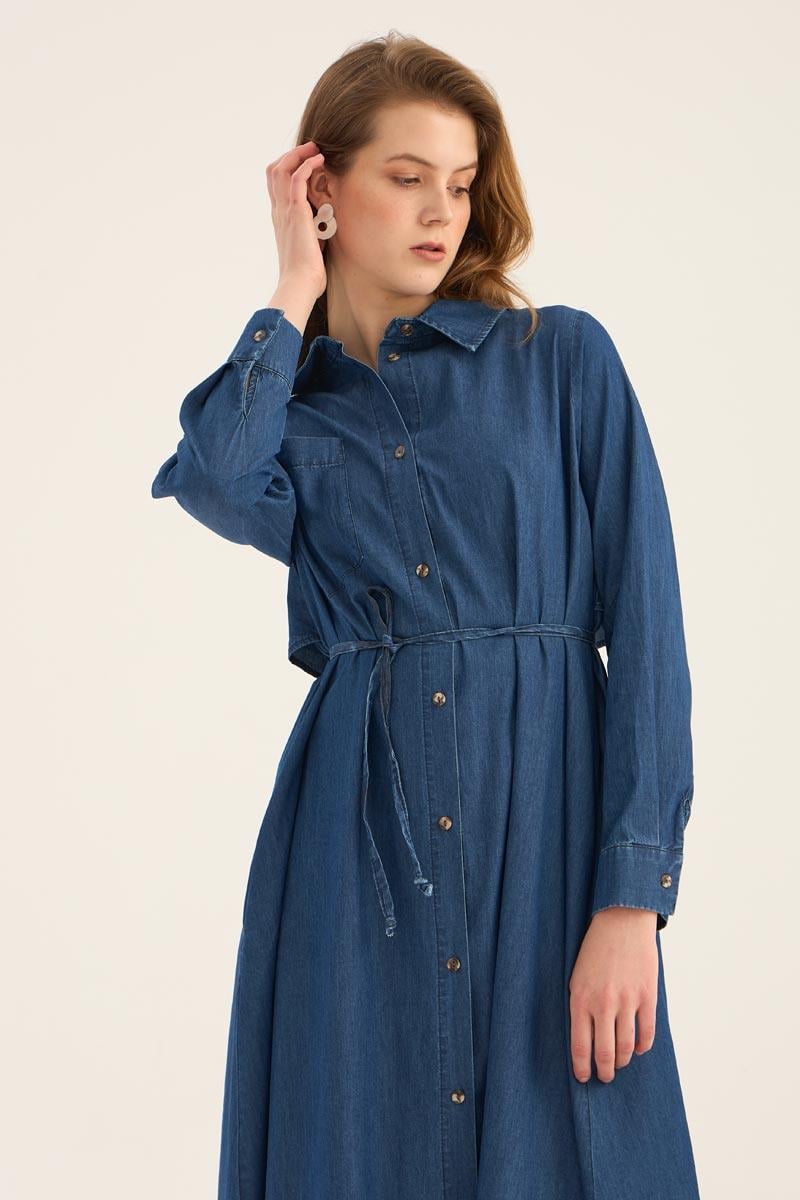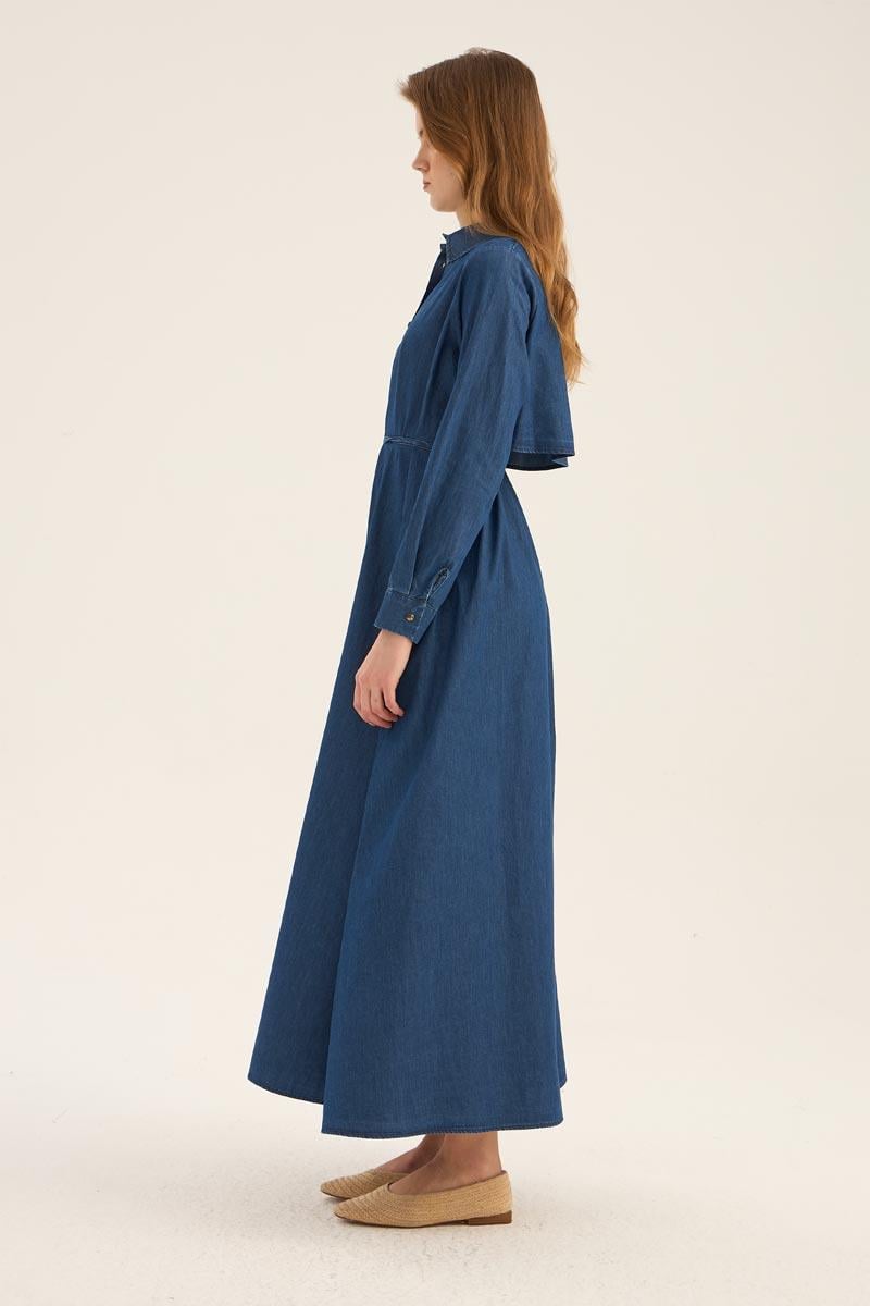 Zamansız denim dokusunu modern bir kesimle buluşturan bu elbise, sade ama güçlü bir siluet oluşturur. Hafif dokusu ve akıcı formu sayesinde gün boyu konfor sağlarken, özenli dikiş detayları tasarıma sofistike bir duruş kazandırır.