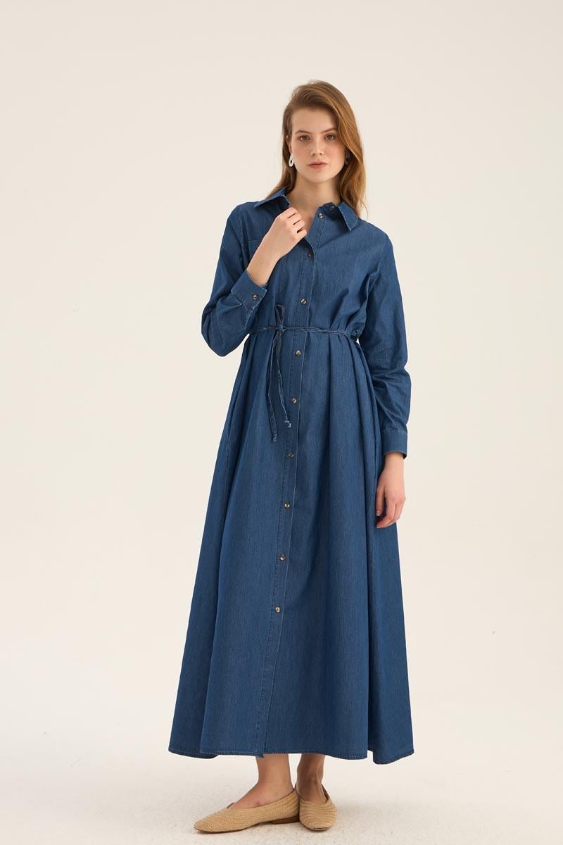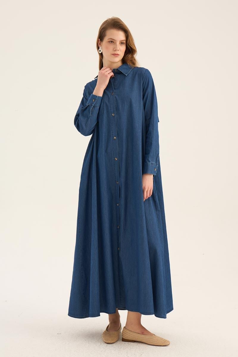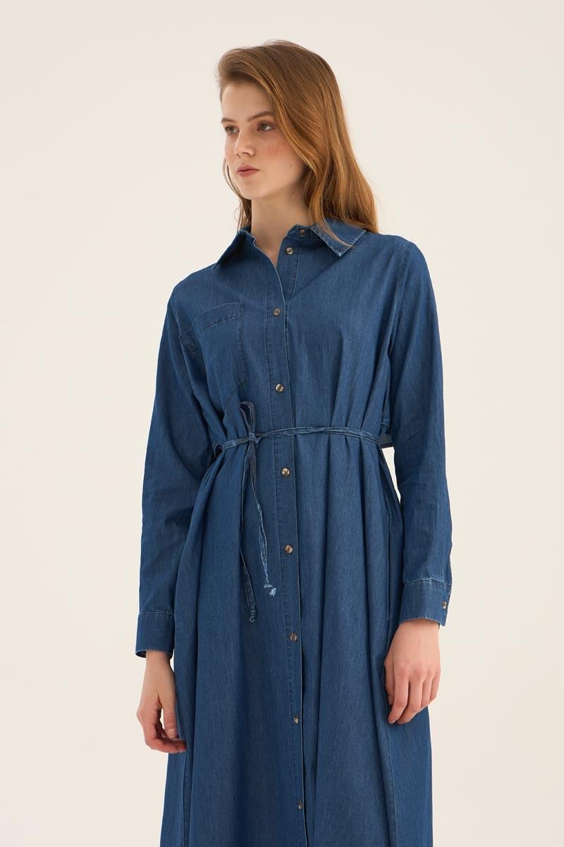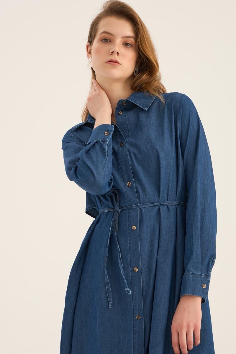 Zamansız denim dokusunu modern bir kesimle buluşturan bu elbise, sade ama güçlü bir siluet oluşturur. Hafif dokusu ve akıcı formu sayesinde gün boyu konfor sağlarken, özenli dikiş detayları tasarıma sofistike bir duruş kazandırır.