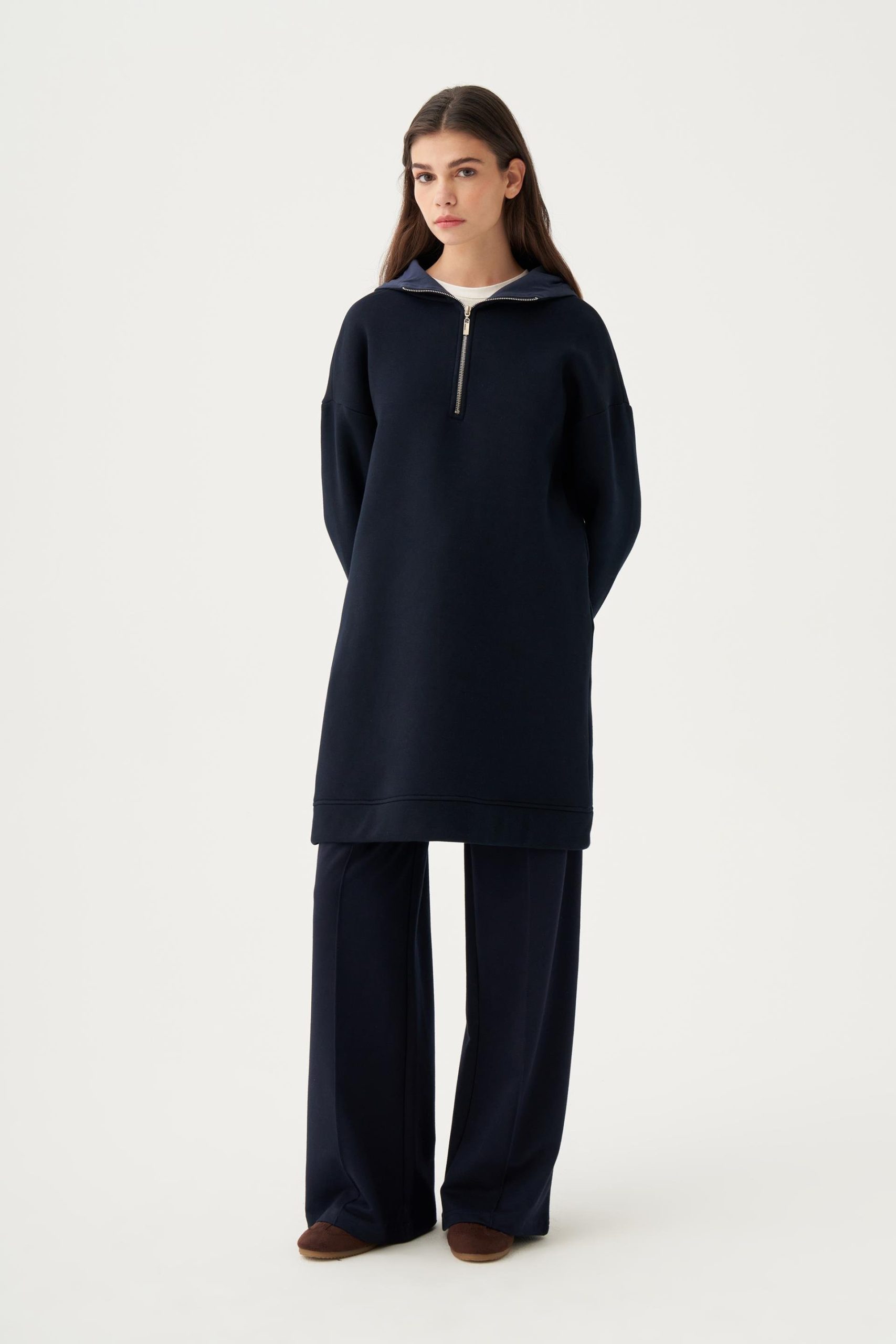 Lacivert-Pamuklu Yarım Patlı Fermuarlı Tunik