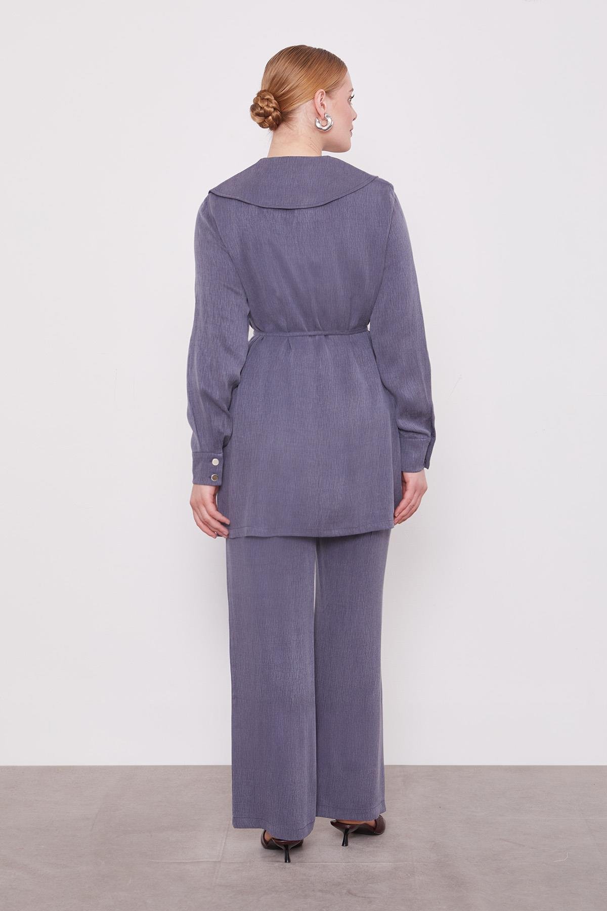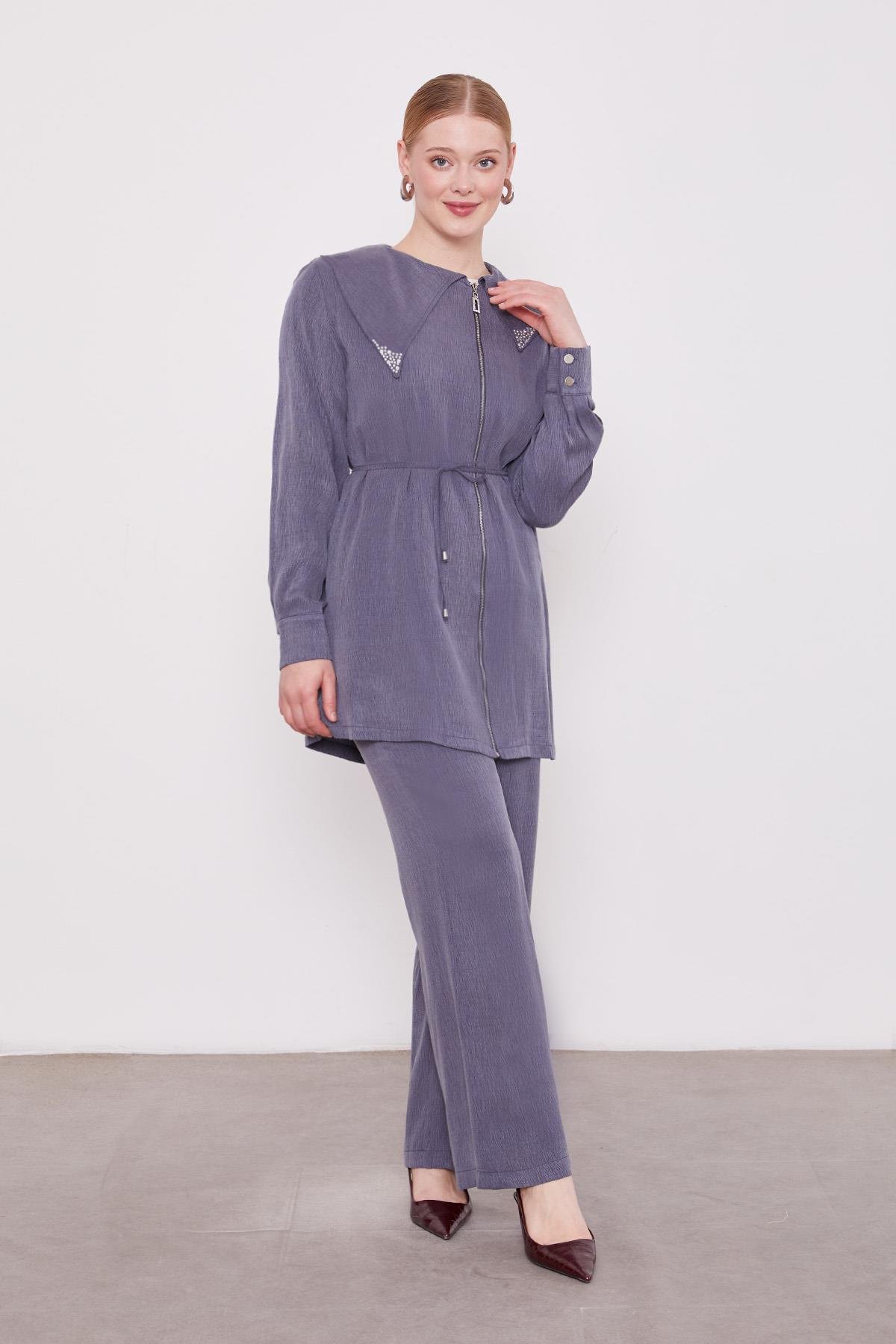 Lacivert Yakası Taşlı Cupra İkili Takım
