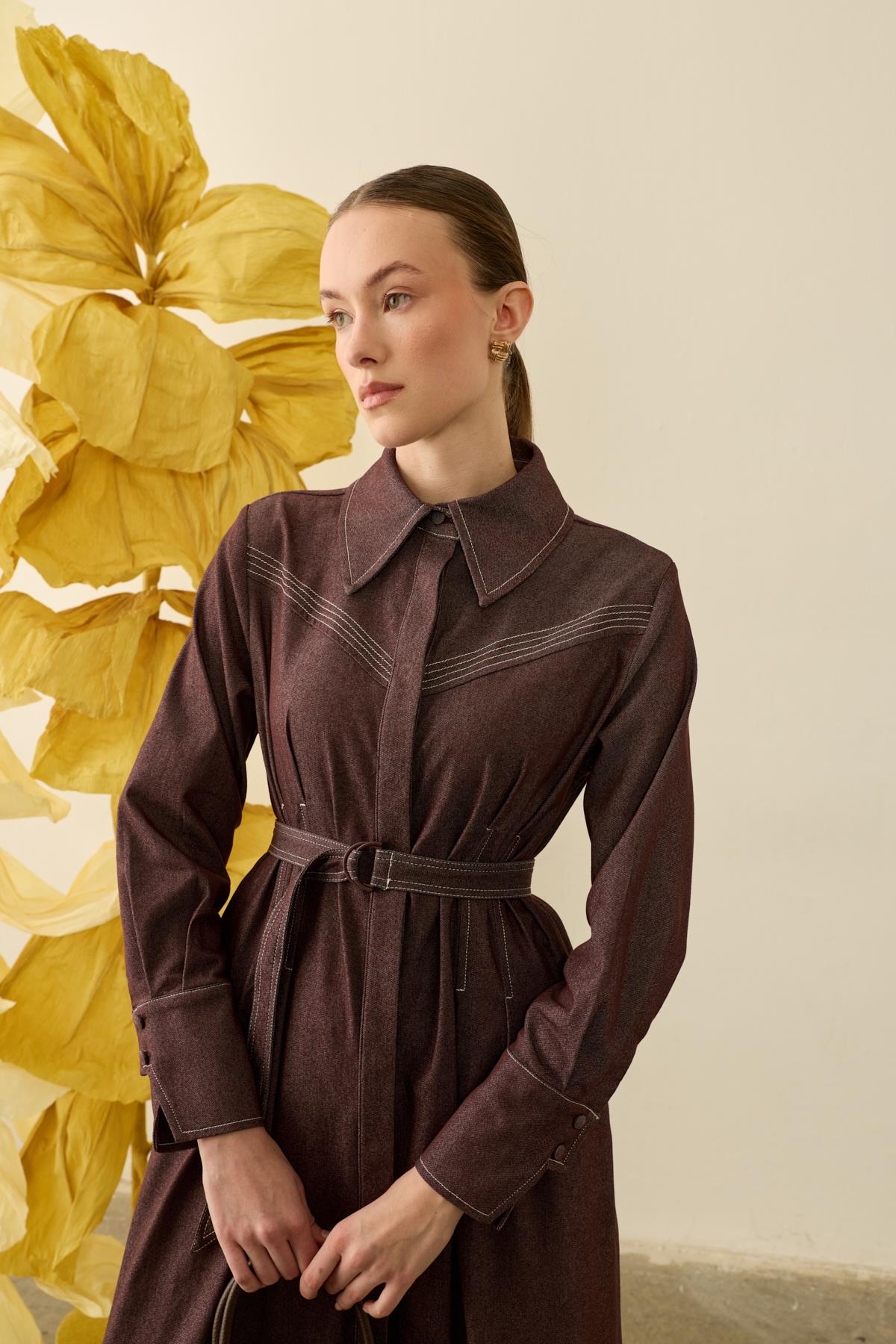 Linda Kontrast Dikiş Detaylı Elbise KAHVERENGİ