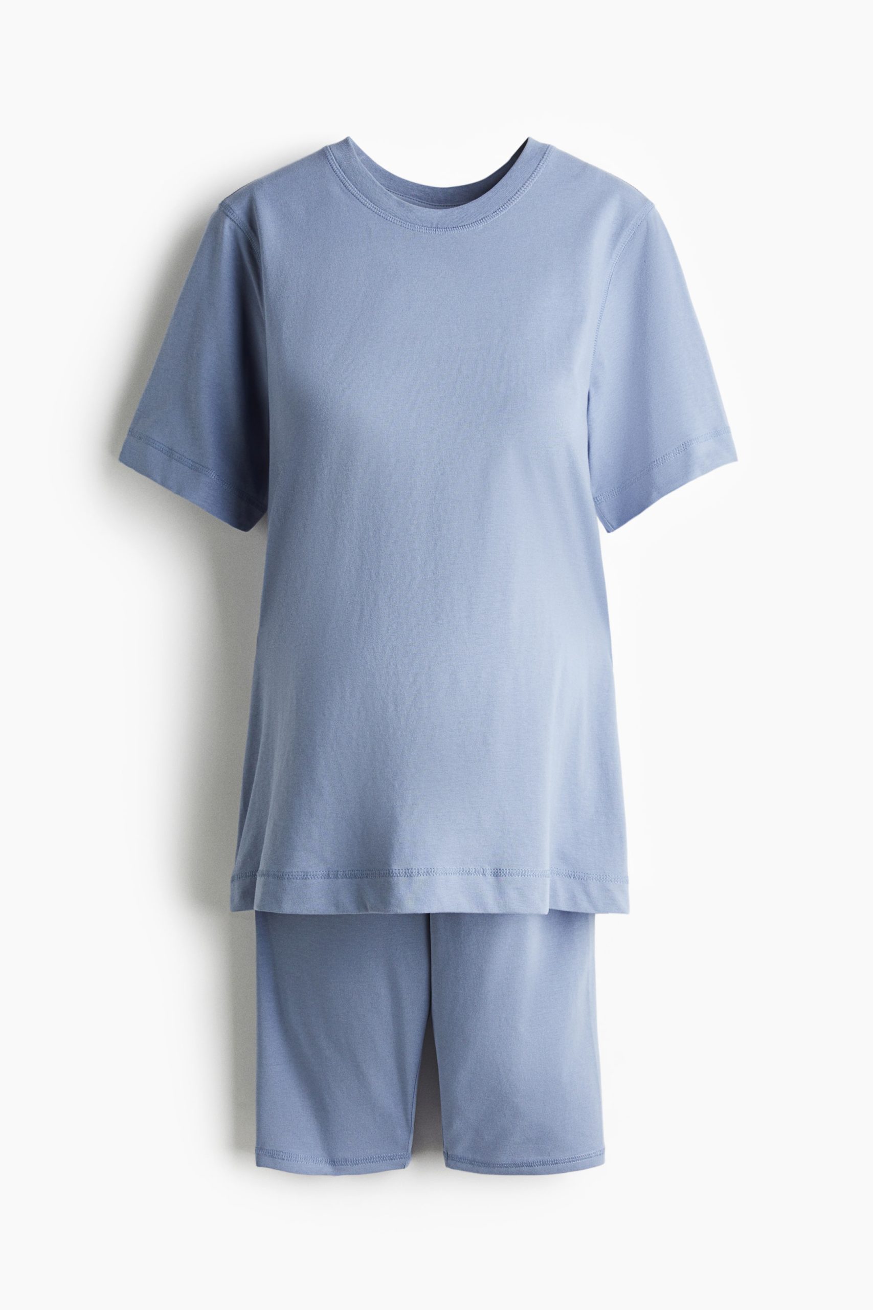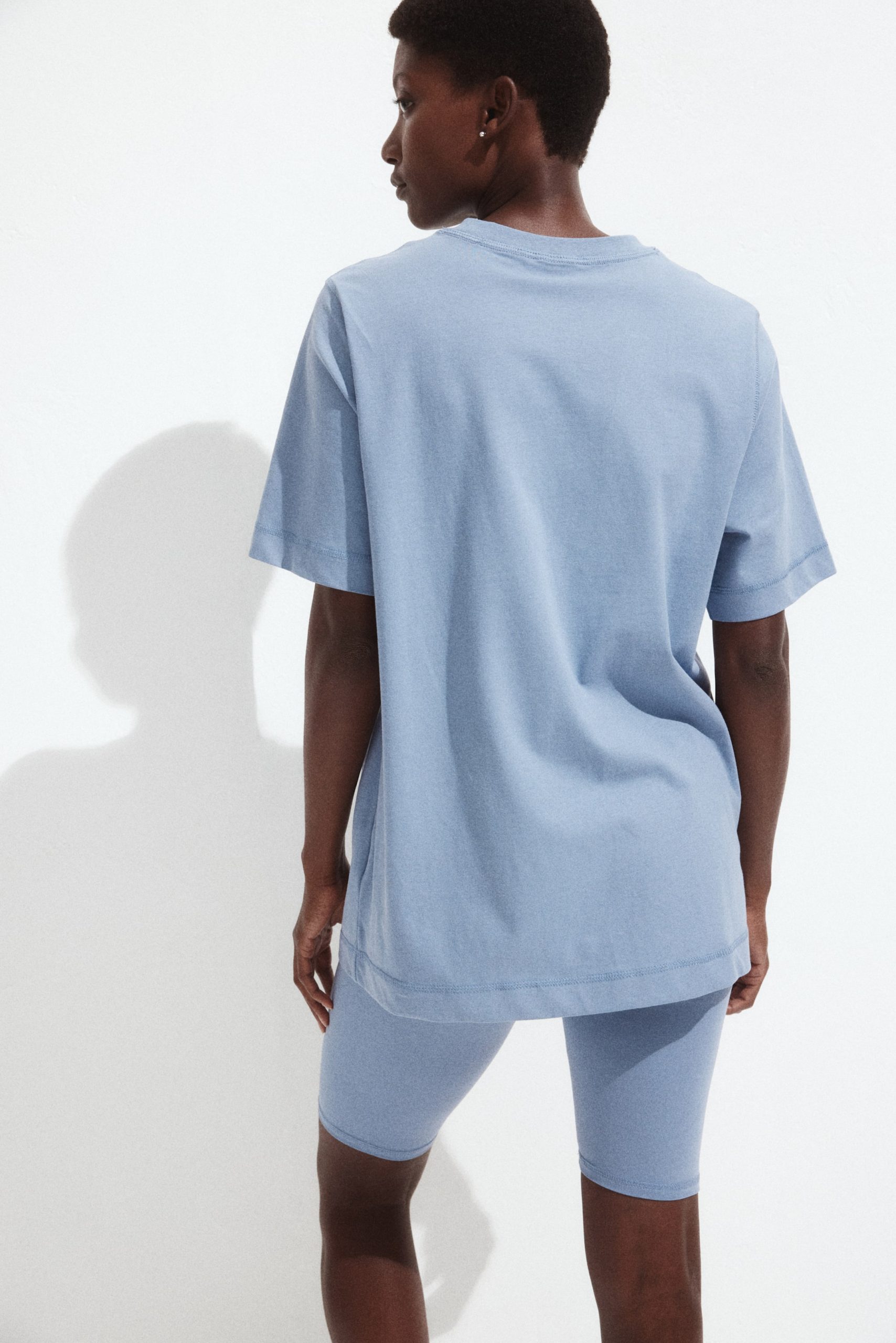 Pamuklu yumuşak jarseden tişört ve kısa tayt içeren rahat set. Karna en iyi şekilde oturması için beli geniş jarse panelli diz boyu şort.