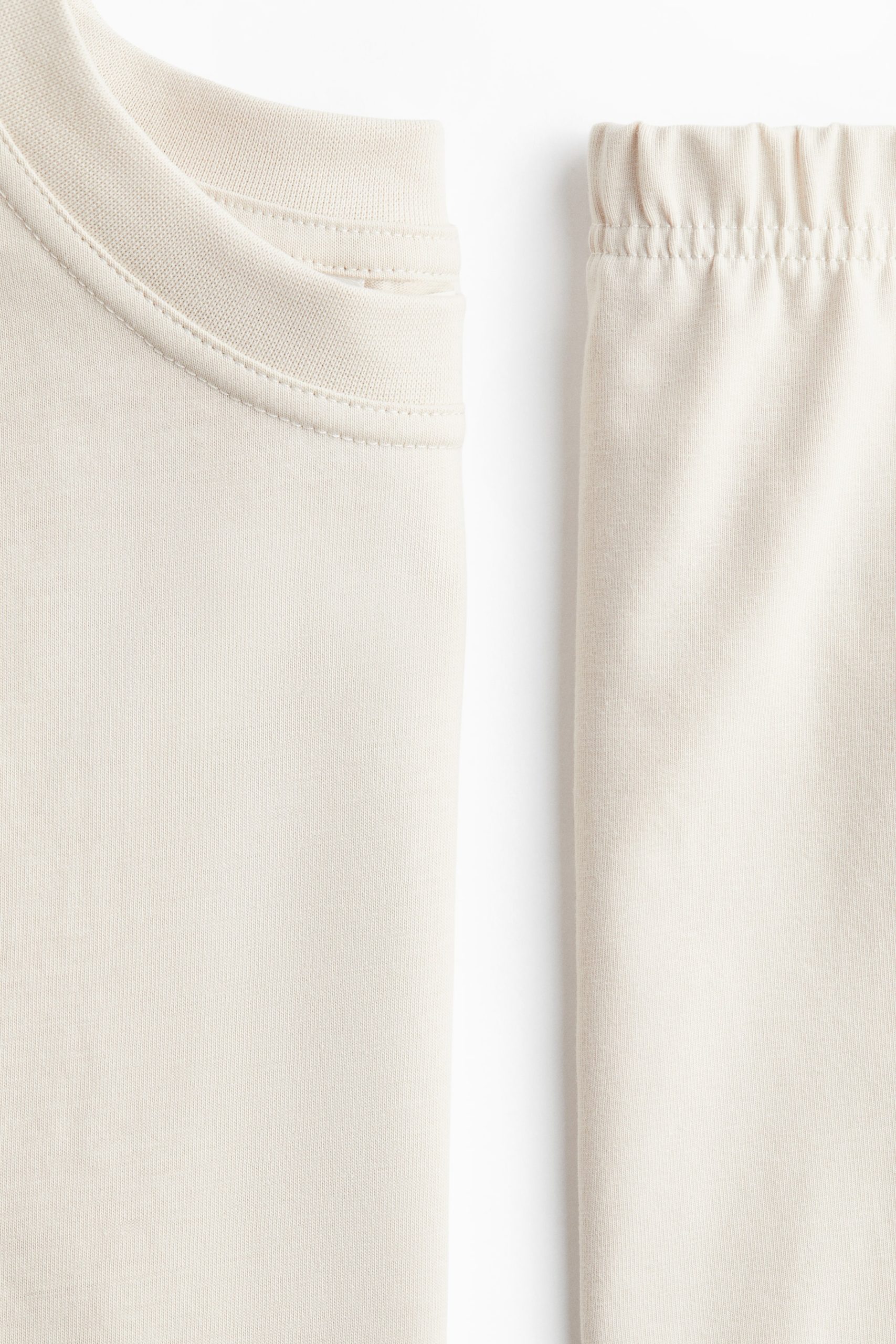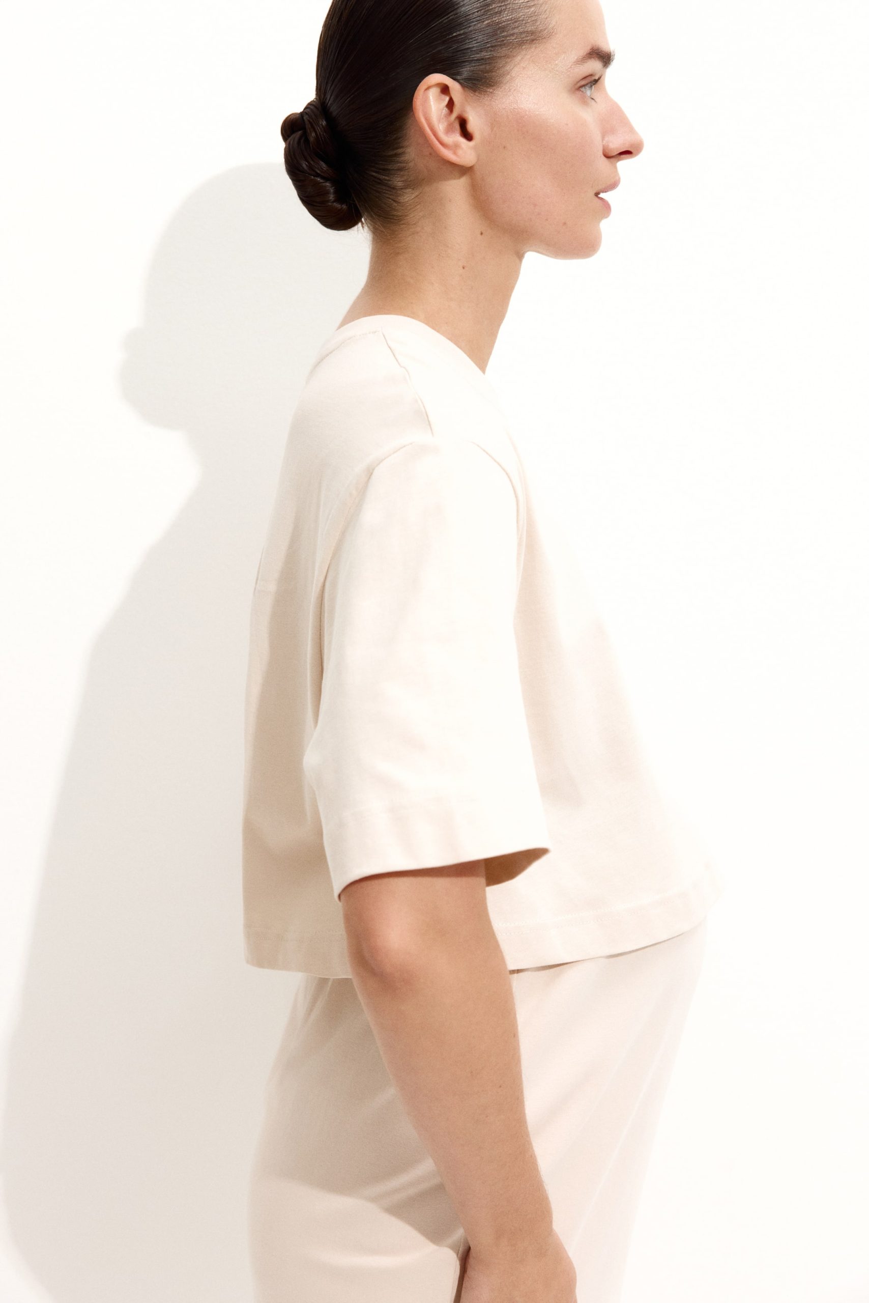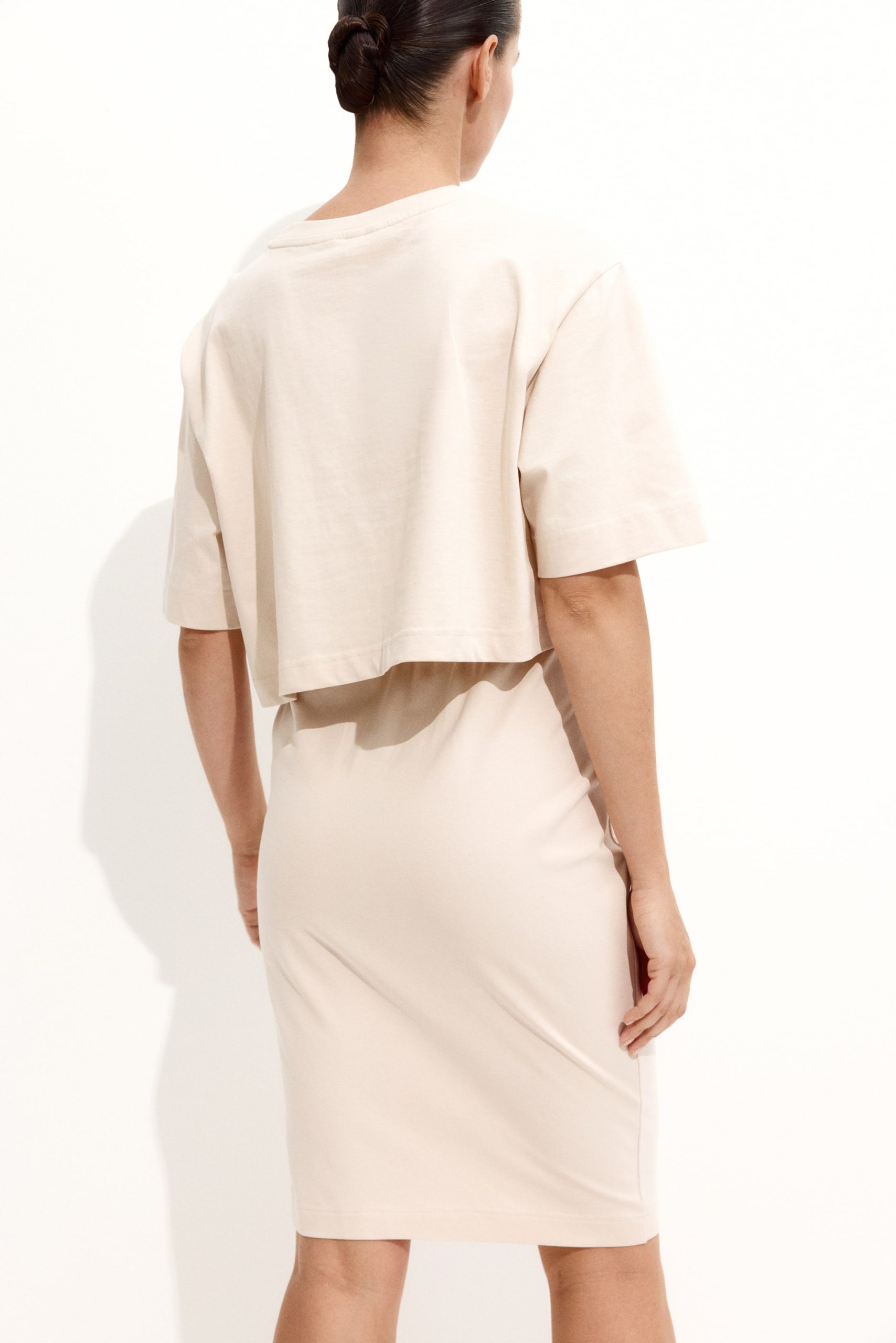 Pamuklu yumuşak jarseden üst ve etek içeren set. Bisiklet yakalı, düşük omuzlu, dirseklerin hemen yukarısında biten kollu kısa üst. Karna en iyi şekilde oturması için üstte kaplı lastikli, bedene oturan diz boyu etek.