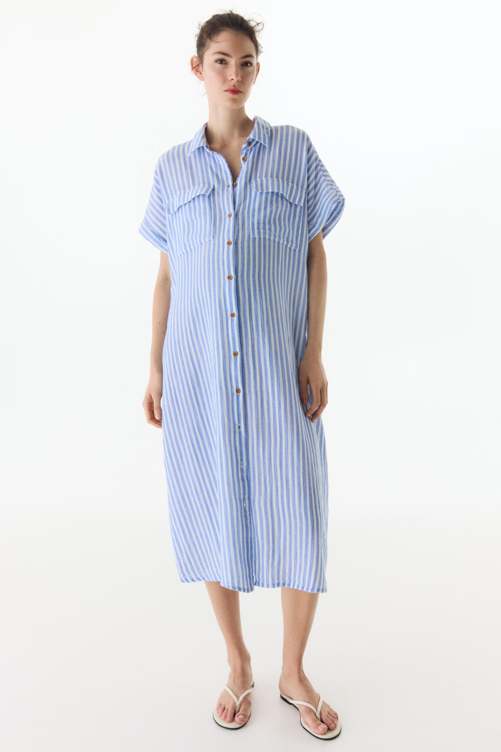 Pamuklu yumuşak muslinden, yakalı, önü düğmeli diz boyu elbise. Dikişle dışa kıvrık kısa kollu, göğüs altında çıkarılabilir kuşaklı. Etek ucu düz. Astarsız.